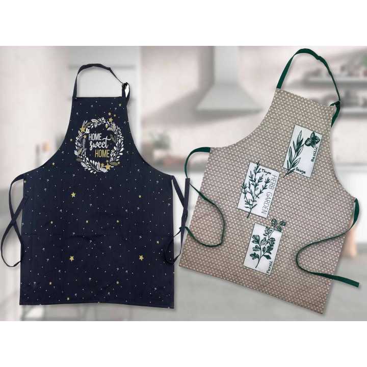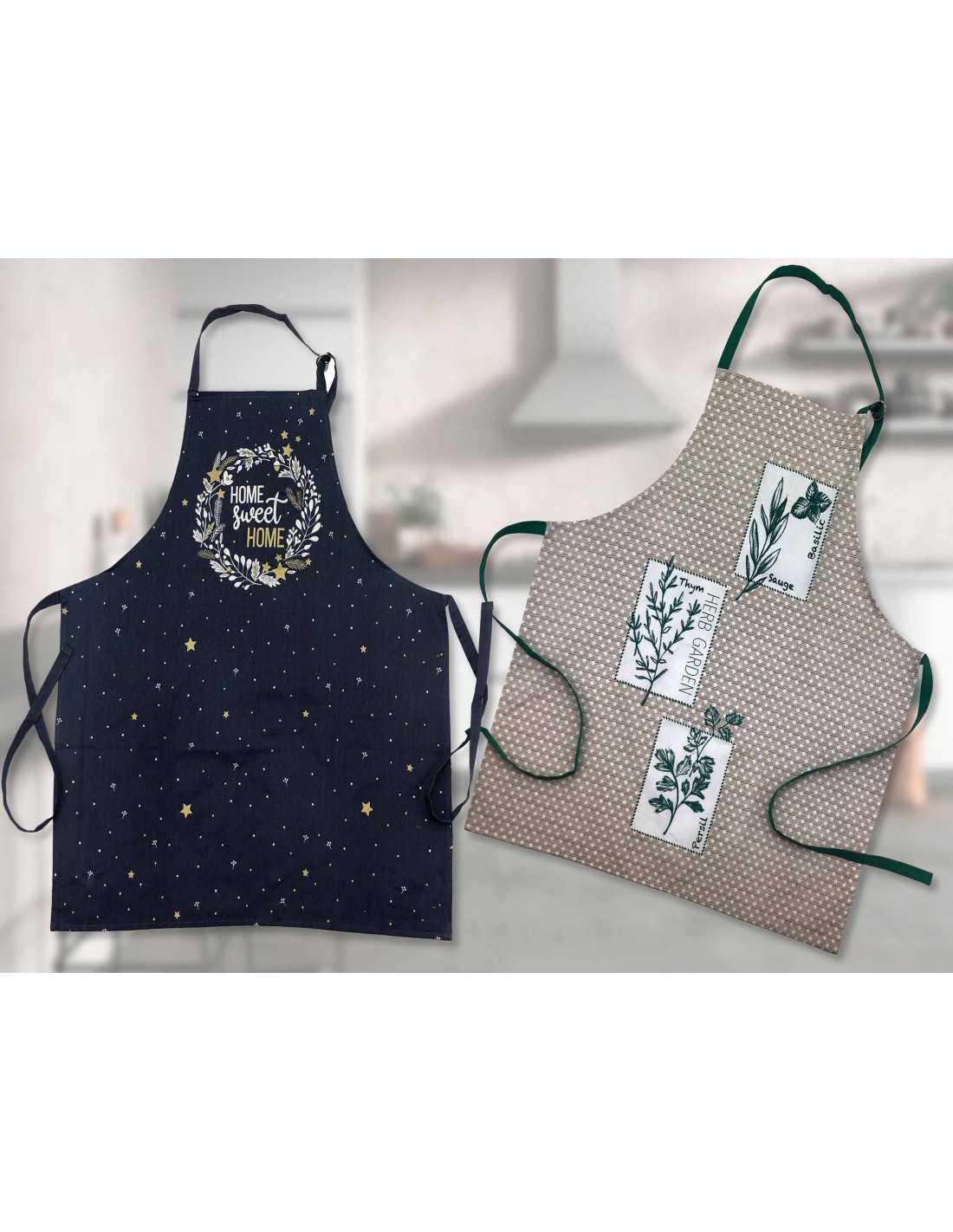 Aventais de cozinha com desenhos muito elegantes em cinza ou marinho. Evite manchas com este prático avental.