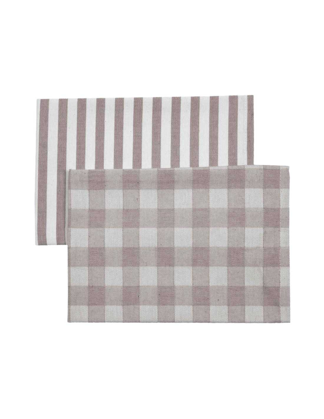 2 panos de cozinha, um com estampado de quadrados e outro de riscas, em 100% algodão. Especialmente indicados para secar, limpar e decorar a sua cozinha.