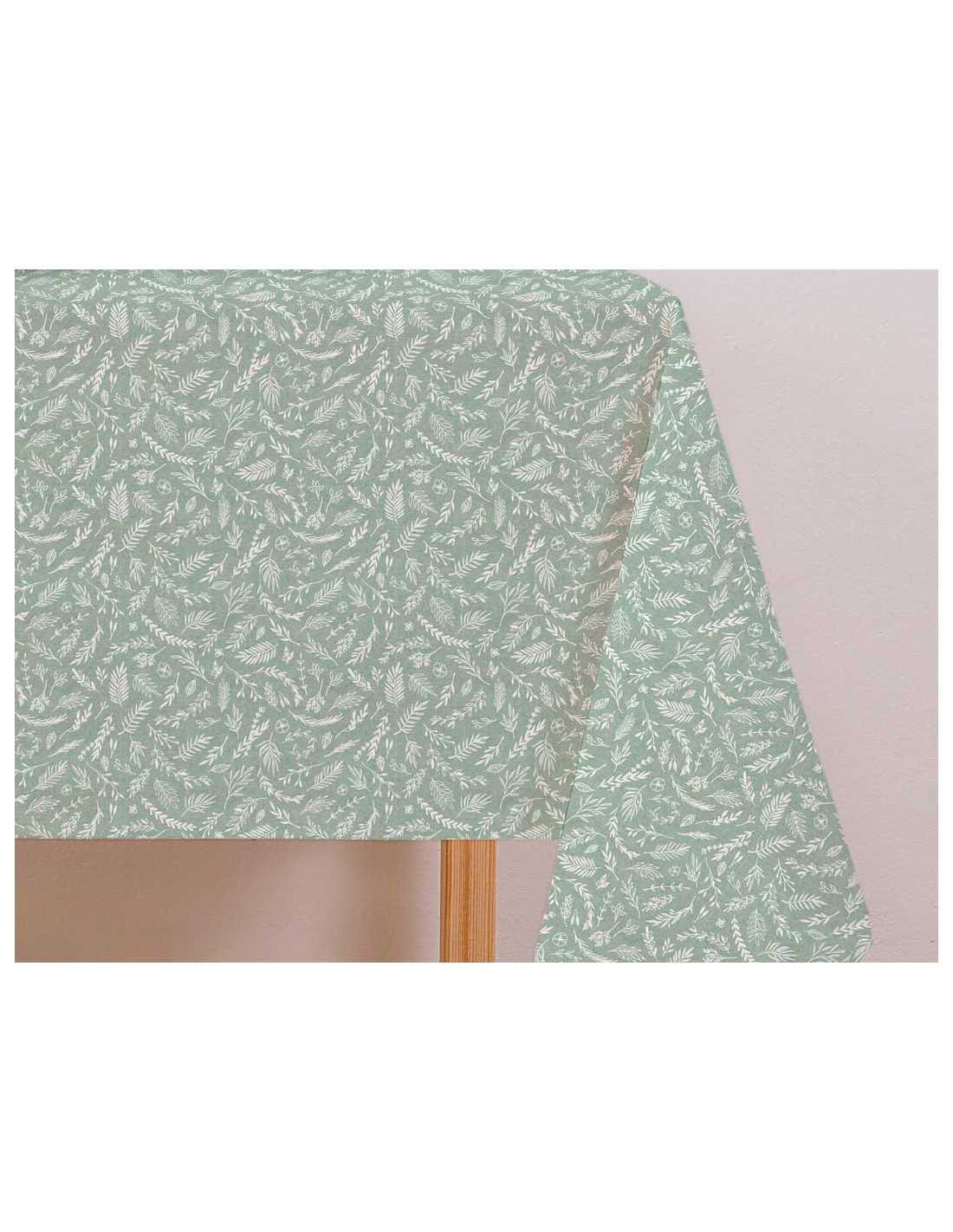 Spiro é uma toalha de mesa resistente a manchas com um estampado de plantas em fundo verde que vai adornar a sua mesa com estilo.