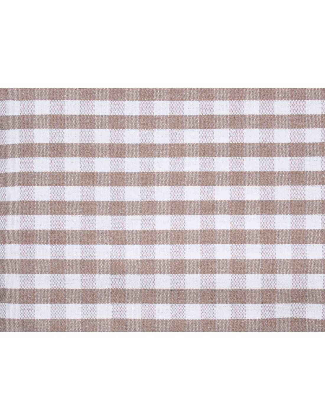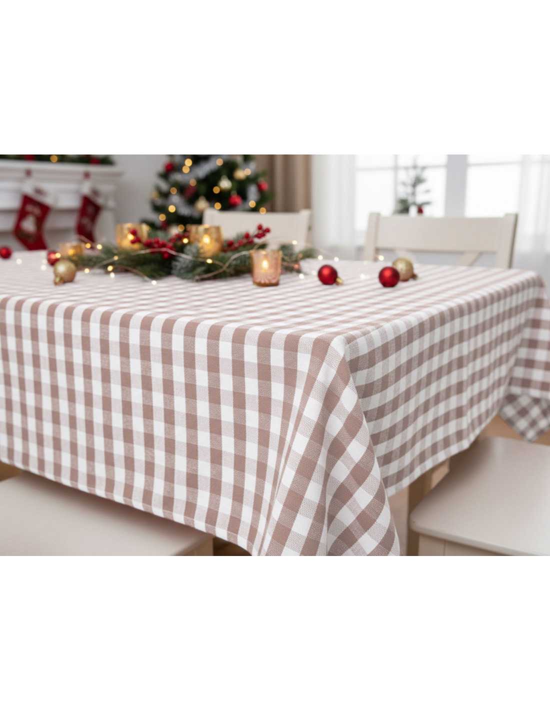 Toalha de mesa aos quadrados vichy em cor bege. Confeccionada em 70% algodão e 30% poliéster. Disponível em 3 cores e 2 tamanhos.