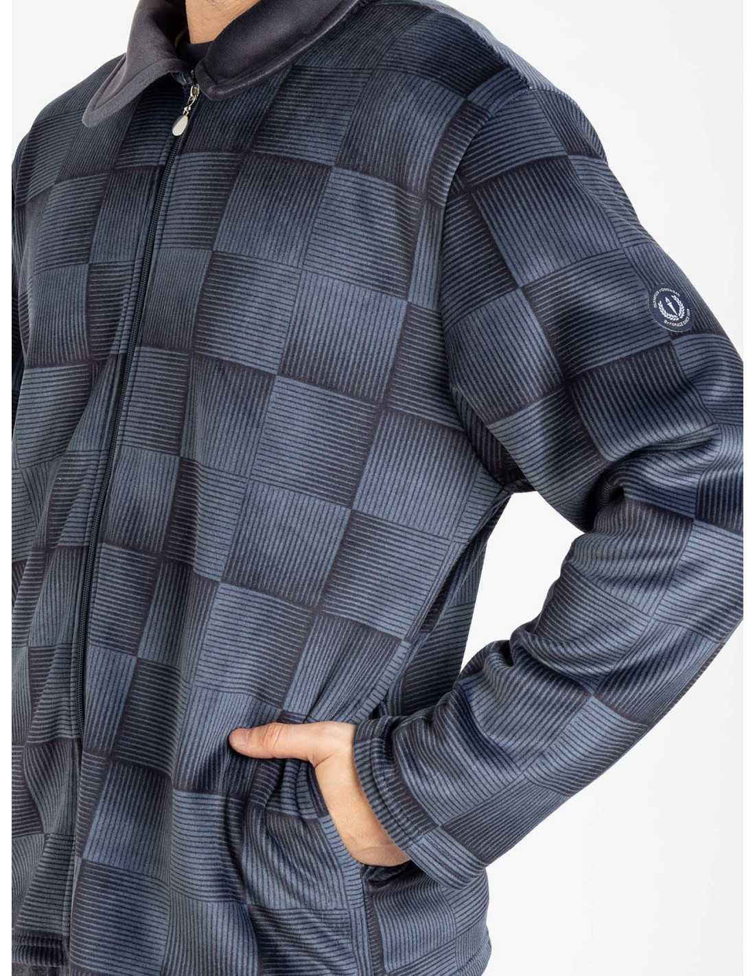 O robe Rurik é feito de tecido Supersoft, um novo material extra macio e quente, ideal para o inverno. Possui um design cinzento com um padrão de linhas, fecho e bolsos.
