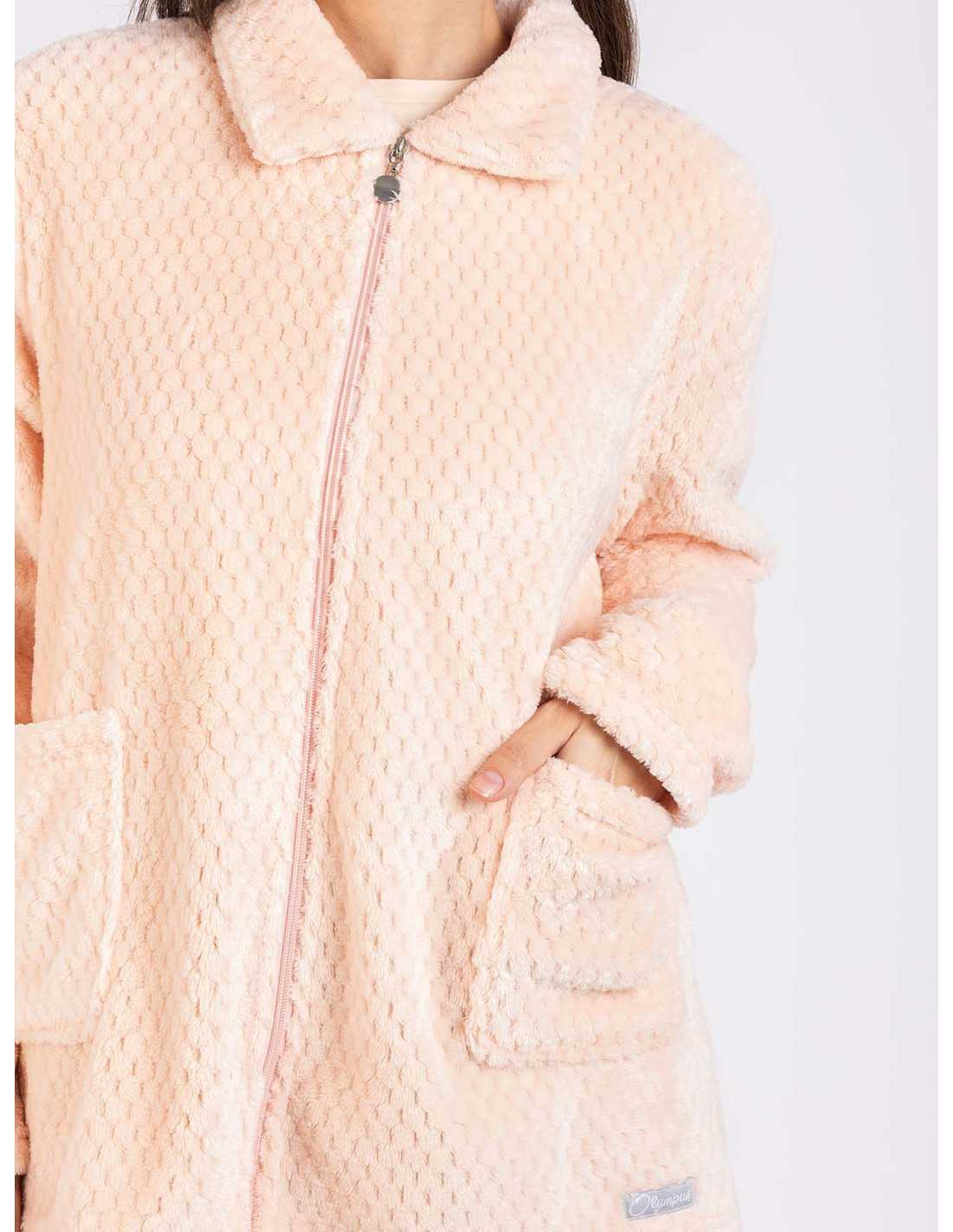 A robe Kelda é confecionada em tecido coralina, muito suave e quente, ideal para o inverno. Apresenta um design em cor salmão e possui fecho de correr e bolsos.