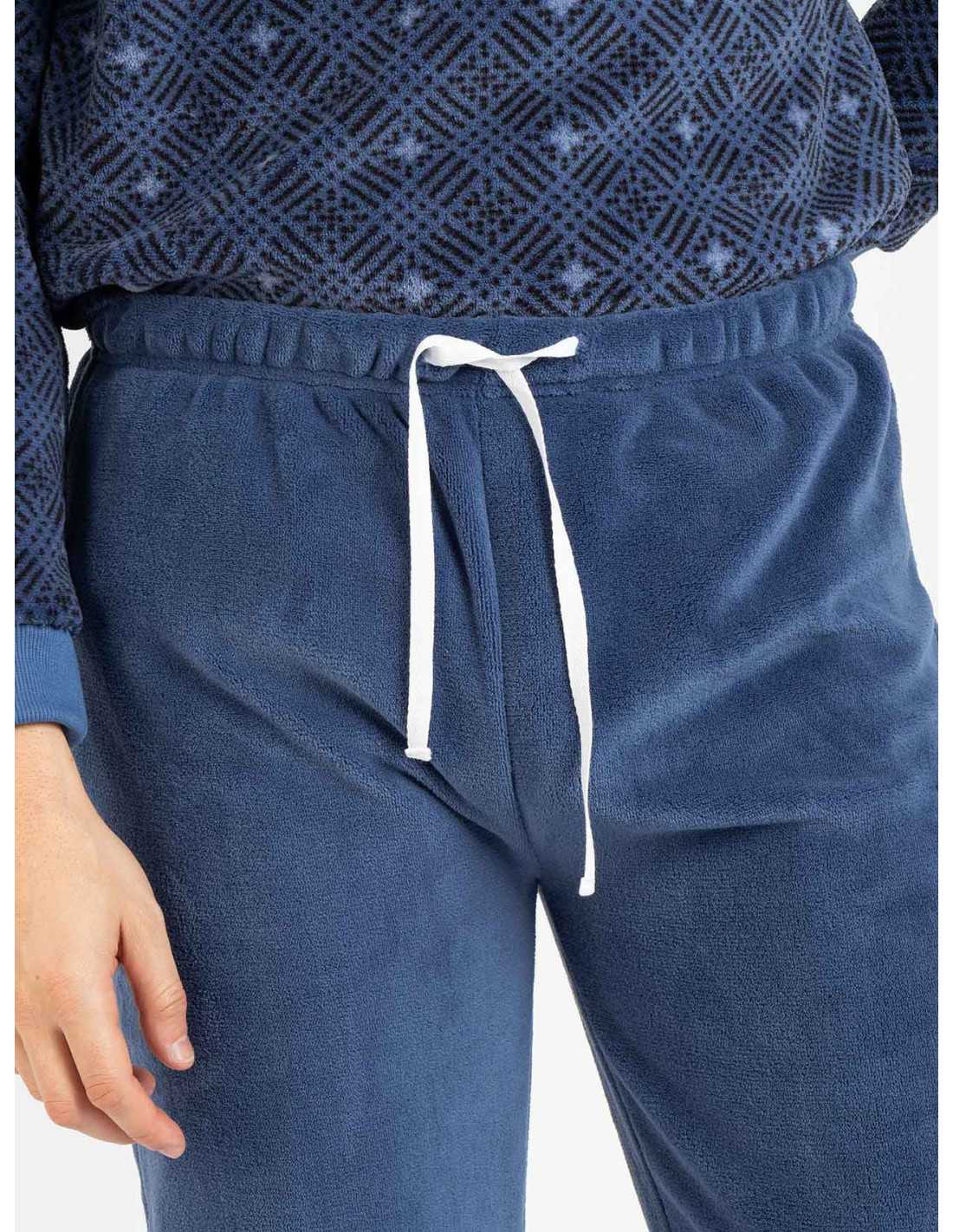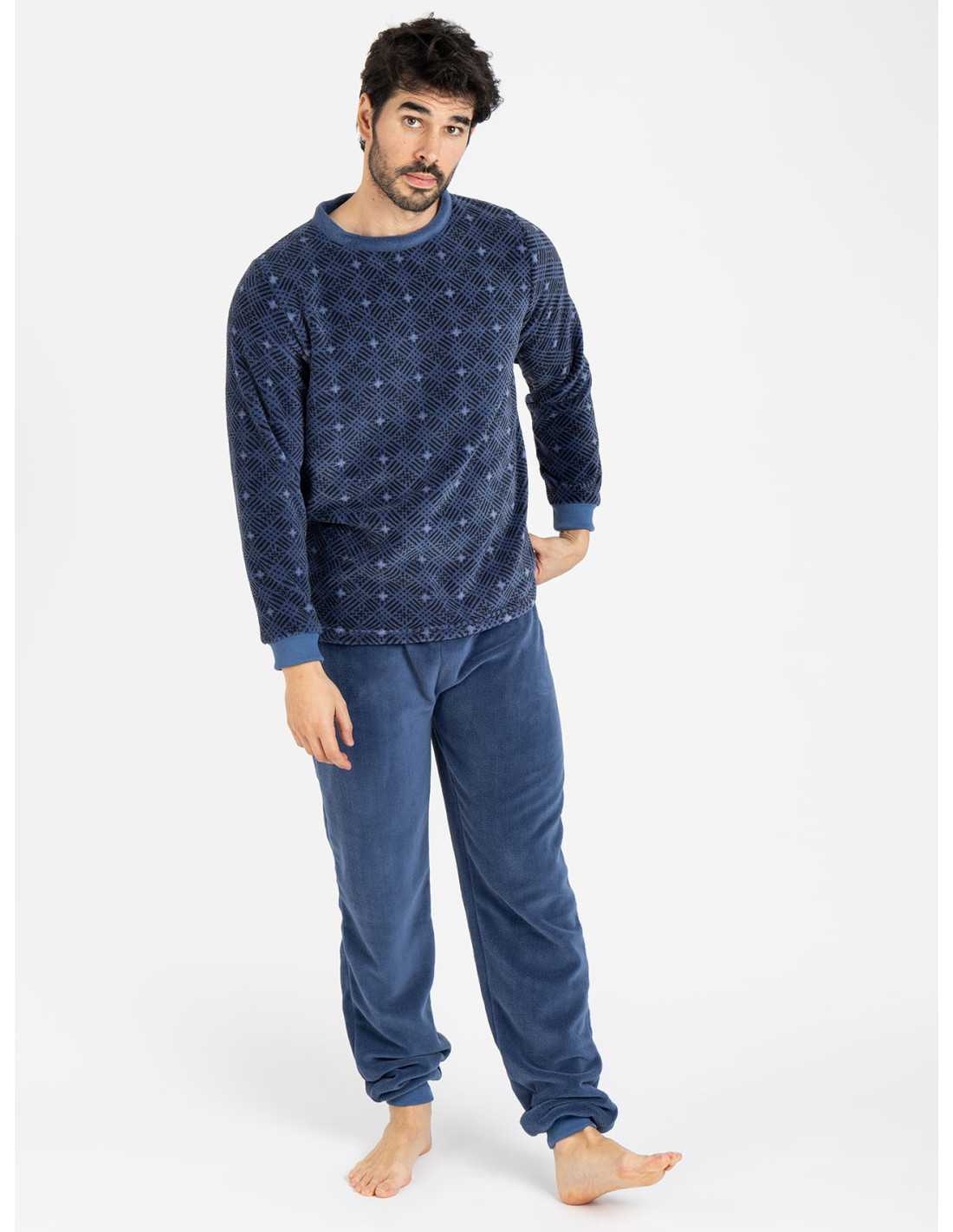O pijama Vidar é fabricado em tecido sintético muflão, proporcionando um ótimo aquecimento e sendo perfeito para o inverno. A blusa apresenta um desenho geométrico com decote redondo, e a calça é lisa azul-marinho, com punhos e cós elástico com cordão. Desfrute dos seus momentos de lazer e relaxamento em casa com os nossos pijamas.