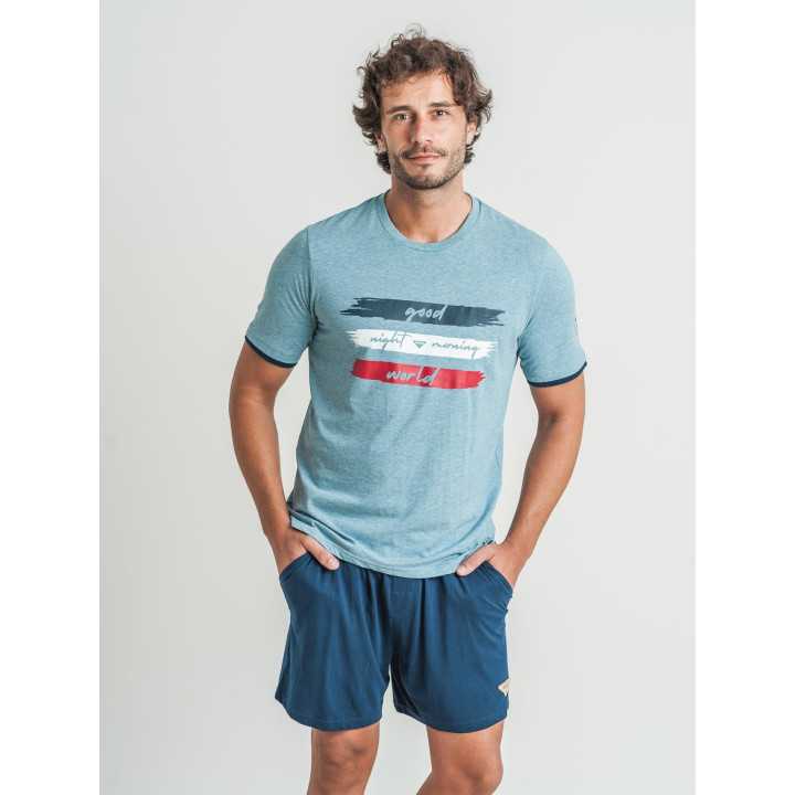 O modelo World é um pijama confortável composto por uma camiseta de manga curta em malha lisa azul claro, gola redonda, com texto estampado no centro do peito, e efeito manga dupla em malha lisa azul marinho. Calções em malha azul com cordão ajustável e bolso em contraste.