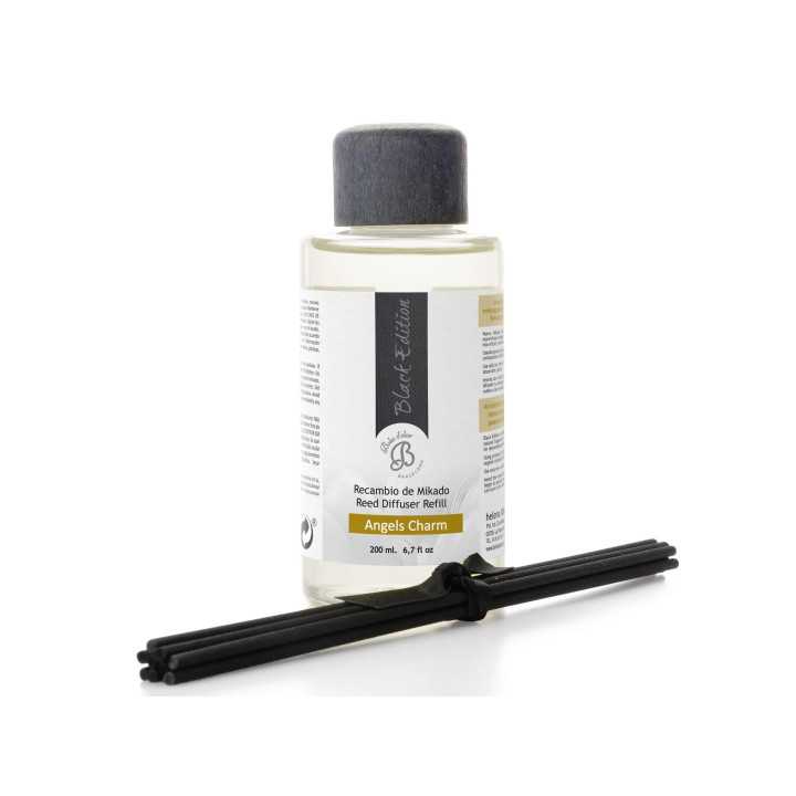 Recarga para o mikado Black Edition da fragrância Angels Charm. A recarga Mikado Black Edition ajuda a prolongar a vida útil do recipiente de vidro.