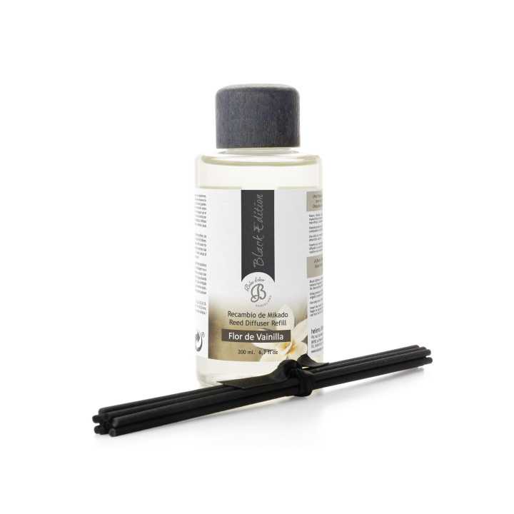 Recarga para o mikado Black Edition da fragrância Flor de baunilha. A recarga Mikado Black Edition ajuda a prolongar a vida útil do recipiente de vidro.