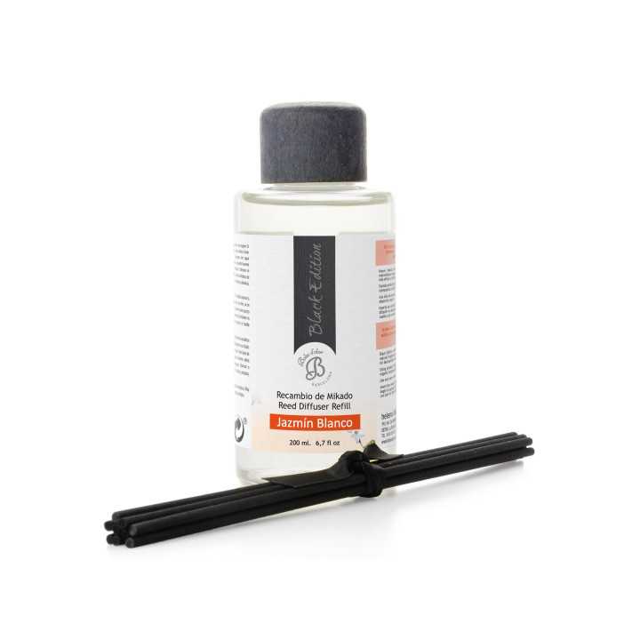Recarga para o mikado Black Edition da fragrância Jasmim Branco. A recarga Mikado Black Edition ajuda a prolongar a vida útil do recipiente de vidro.