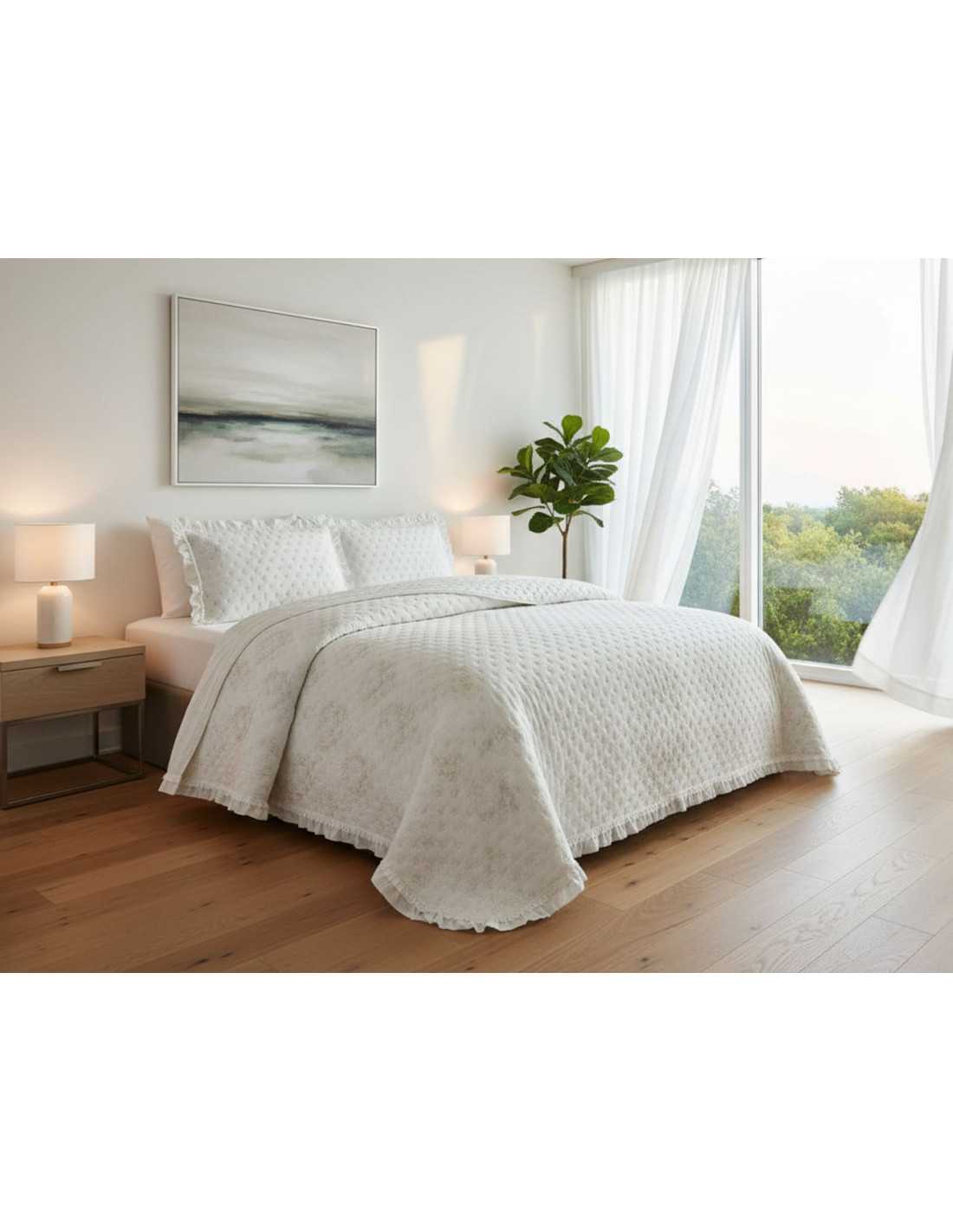 Colcha bouti de meia-estação e verão com enchimento leve, delicado estampado toile de jouy, com duplo folho e toque suave para um descanso perfeito.