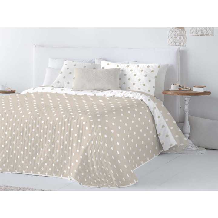 Edredão bouti reversível com estampado de bolinhas brancas sobre fundo bege de um lado e bolinhas bege sobre fundo branco do outro. Edredão com enchimento de 100g, ideal para a primavera e verão.