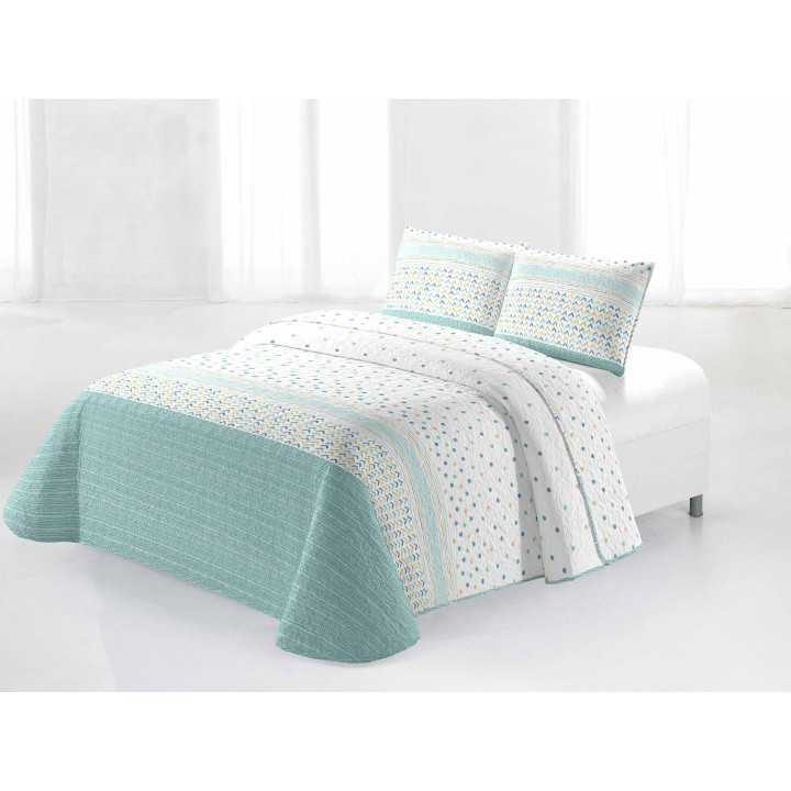 Bonita e decorativa colcha bouti com estampado de diferentes riscas e vários motivos, principalmente em branco e turquesa.