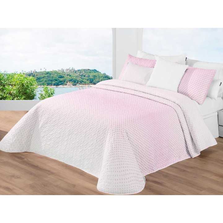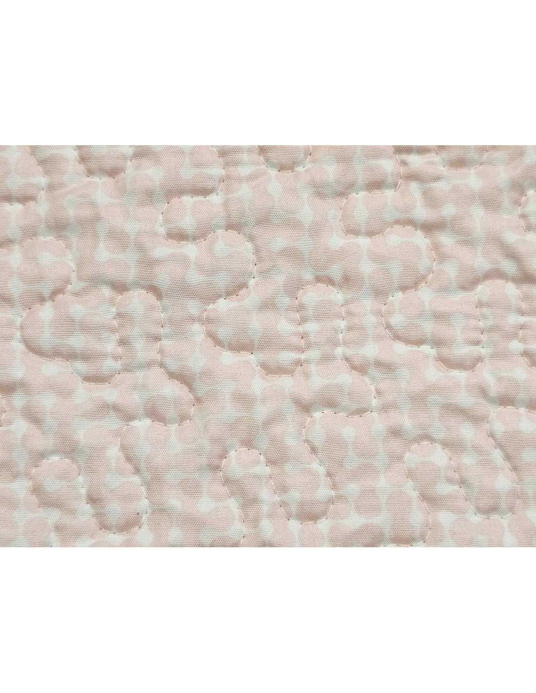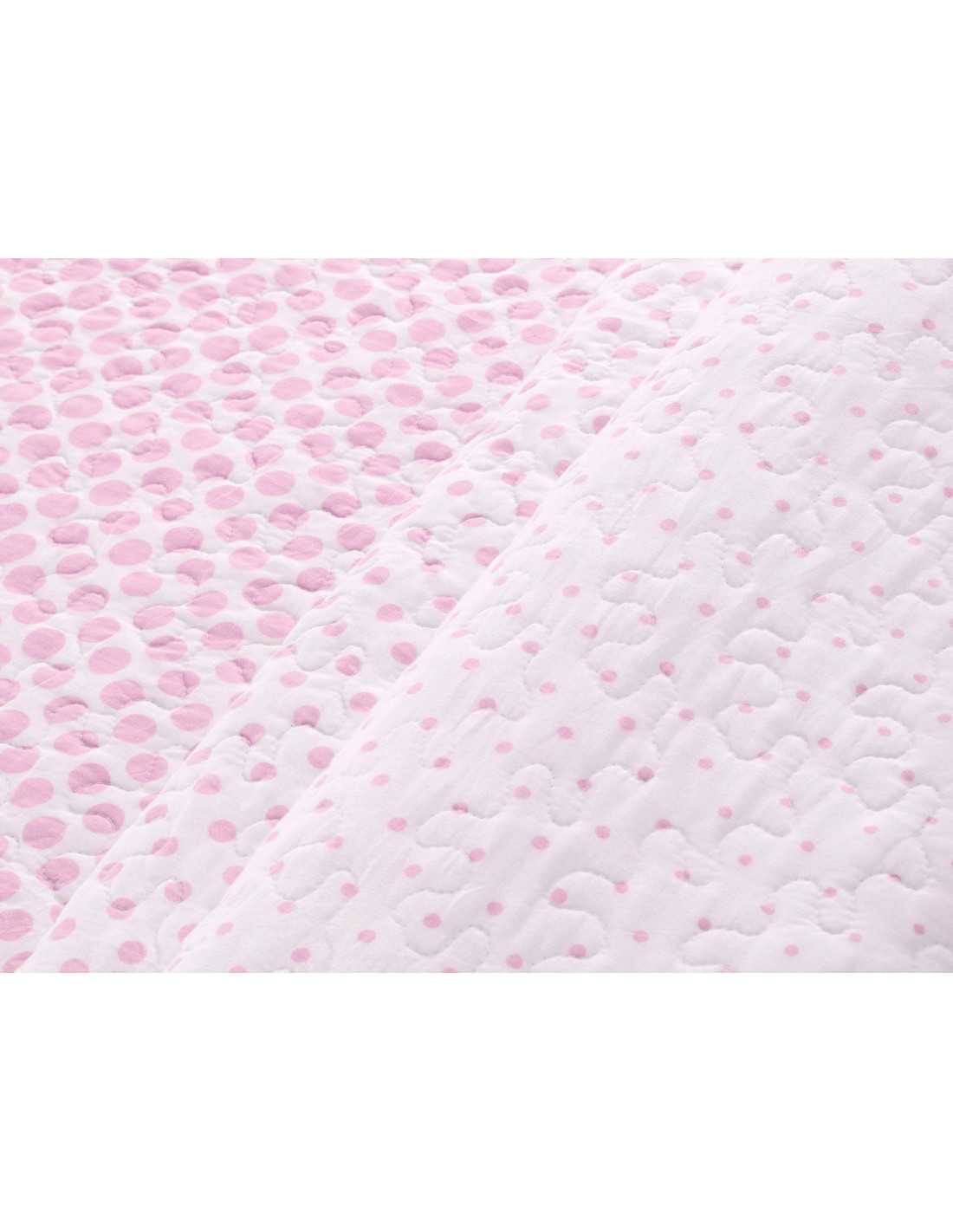 De um lado tem uma estampa de bolinhas grandes e outras menores em rosa suave que vão em degradê até a parte inferior da colcha e no verso tem uma estampa de formas arredondadas em tons rosa sobre fundo branco. Confeccionada em tecido de toque extra macio, parte externa em poliéster e enchimento 100% algodão e com costura de linha.