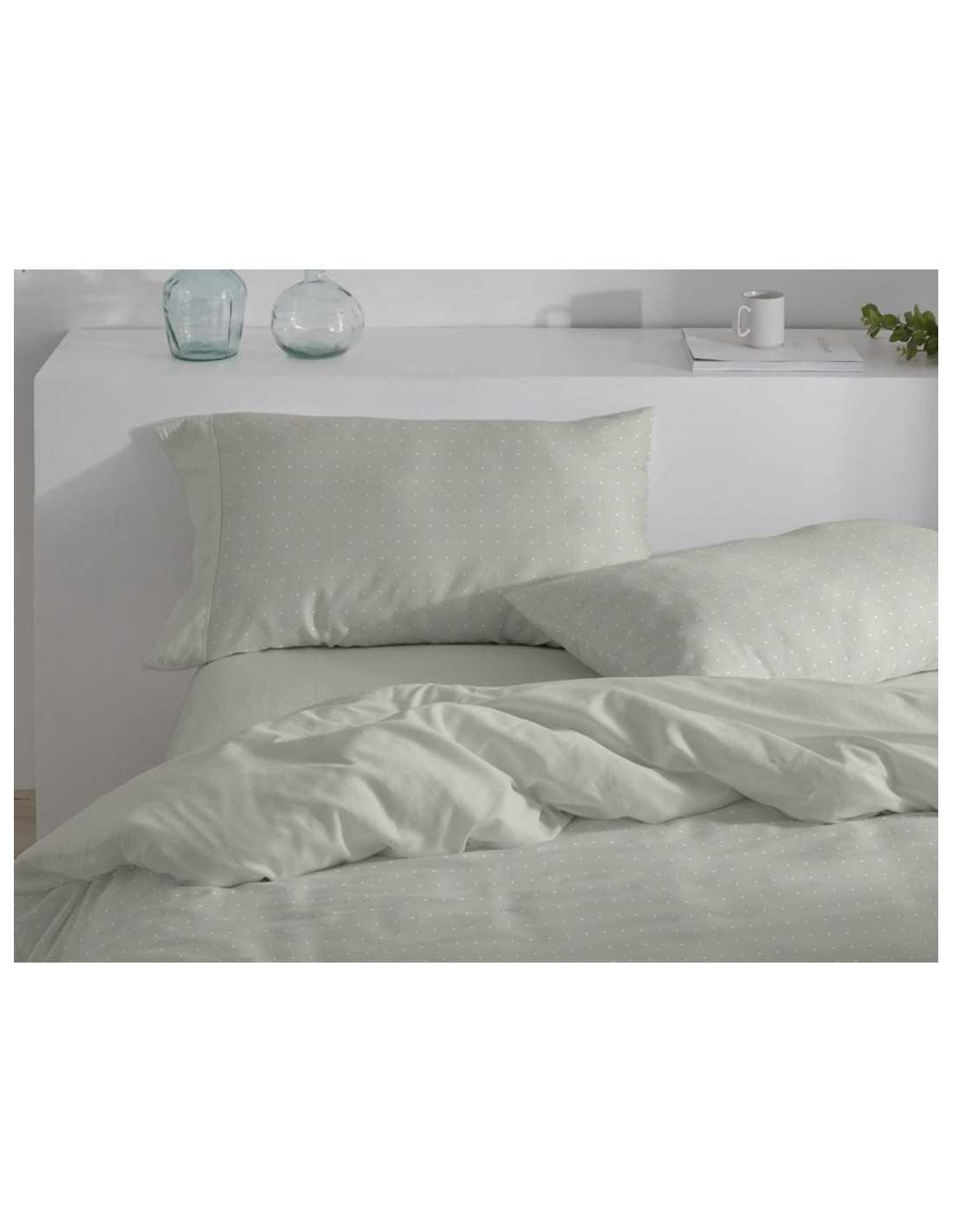 O modelo Nublia da Burrito Blanco é um conjunto de capa de edredão em flanela com 3 peças e um design de bolinhas simples em tons de verde sálvia. Um modelo muito quente e confortável.