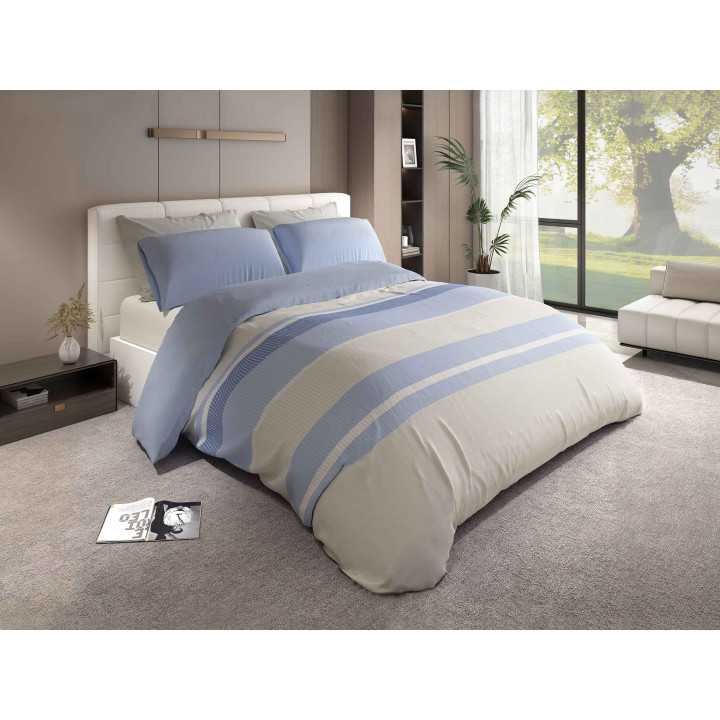 Jogo de capa de edredão de 3 peças com um design decorativo de riscas com linhas. O verso da capa e as fronhas são de cor azul, e o lençol ajustável é de cor bege.