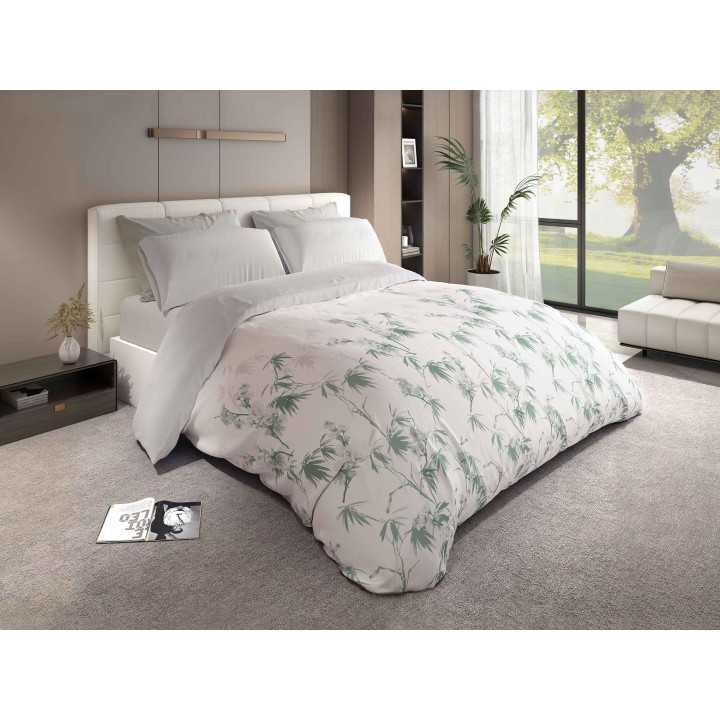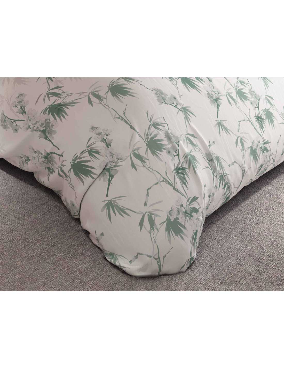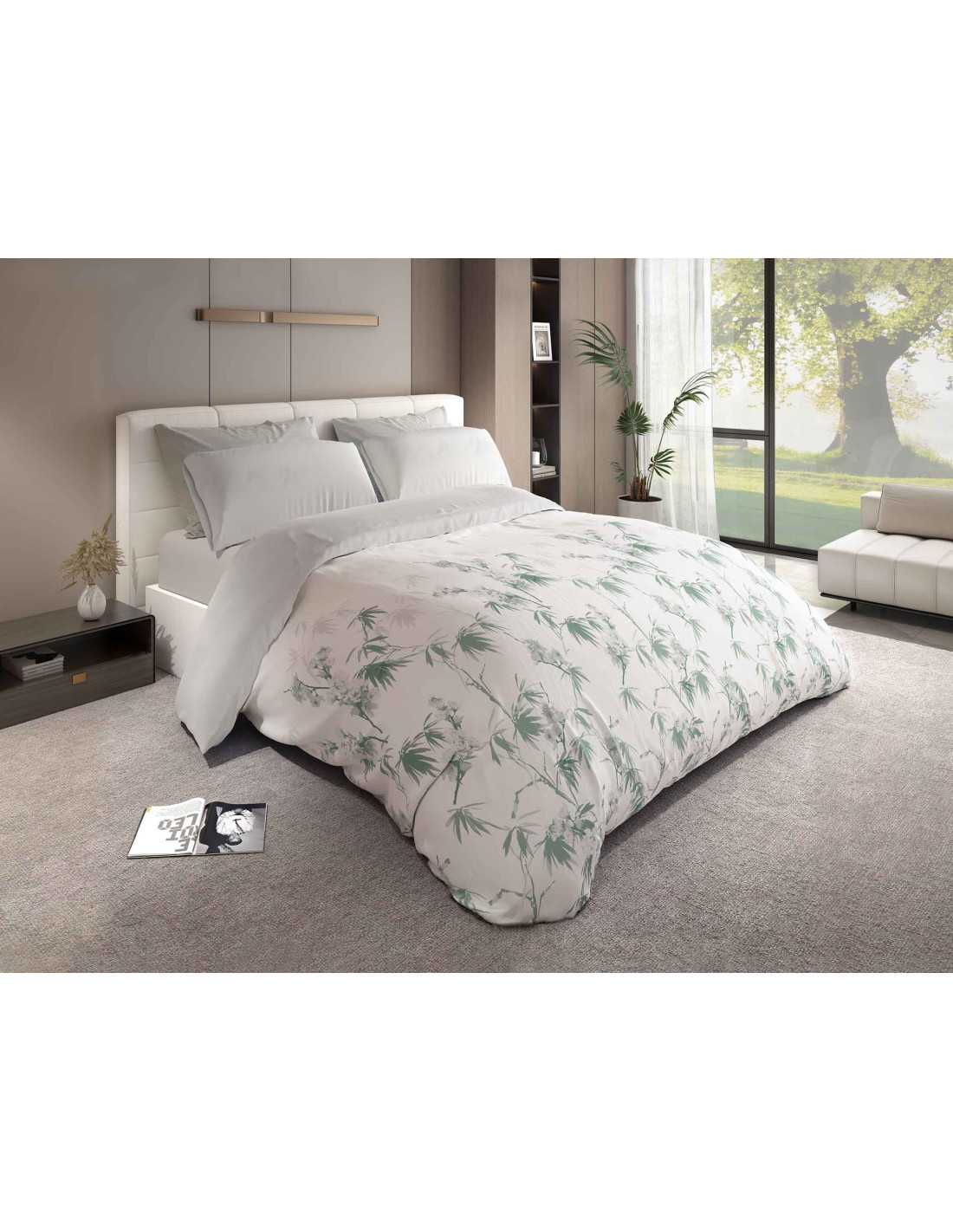 Conjunto de capa de edredão de 3 peças com um bonito desenho botânico em tons de verde sobre um fundo natural. O verso da capa de edredão, as fronhas e o lençol de baixo são num tom cinzento.