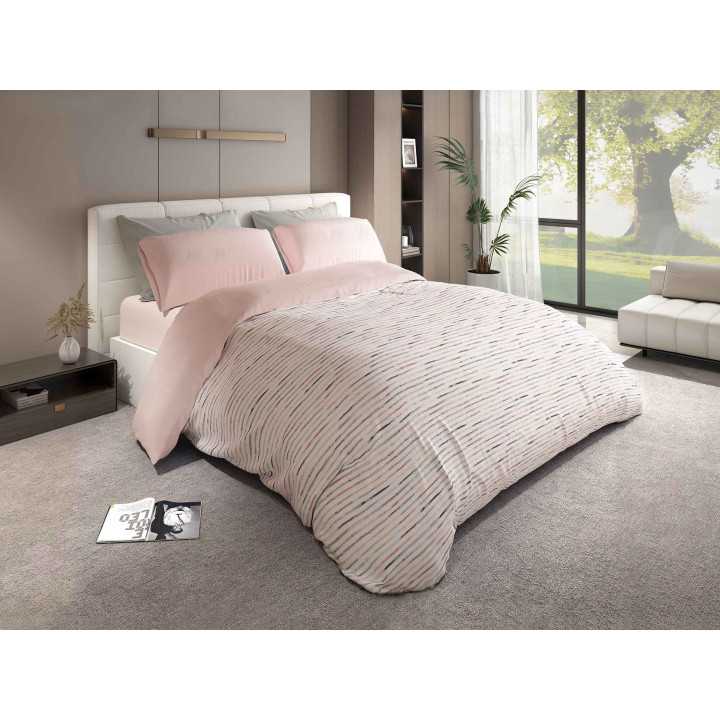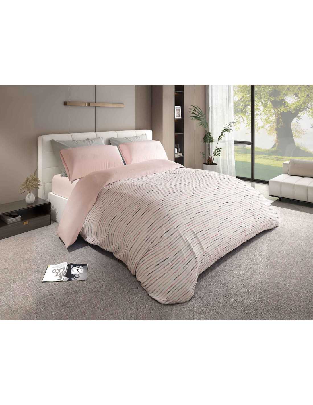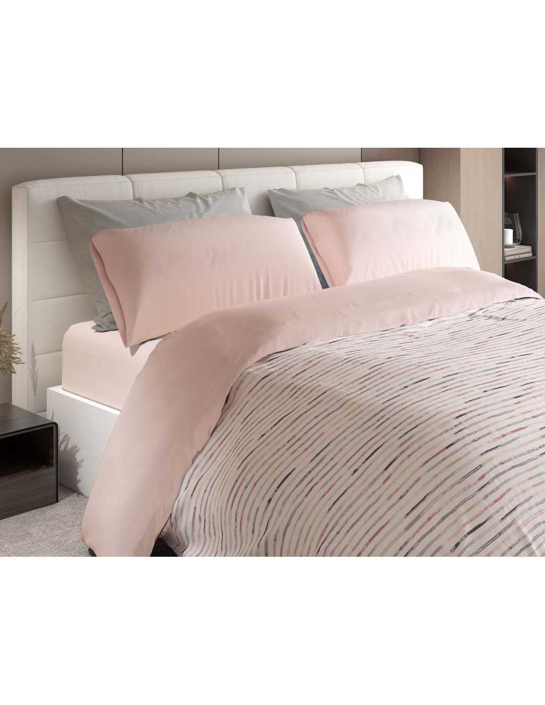 O modelo Nasau é uma capa de edredão de 3 peças com um design moderno, com detalhes coloridos num dos lados e verso rosa, lençol com elástico e fronha. Um design para criar um espaço único no seu quarto.