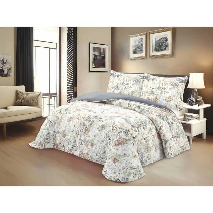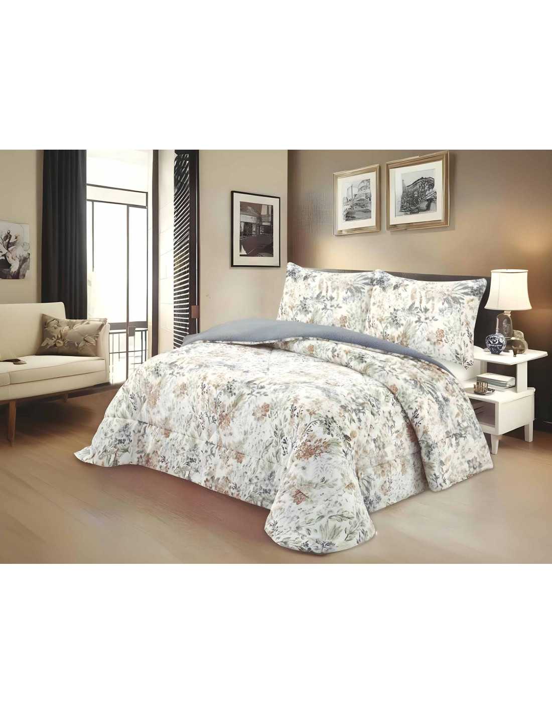 Edredão de sedalina e sherpa com um design natural, com motivos florais multicolores sobre fundo natural. Gramagem total de 600 gramas.