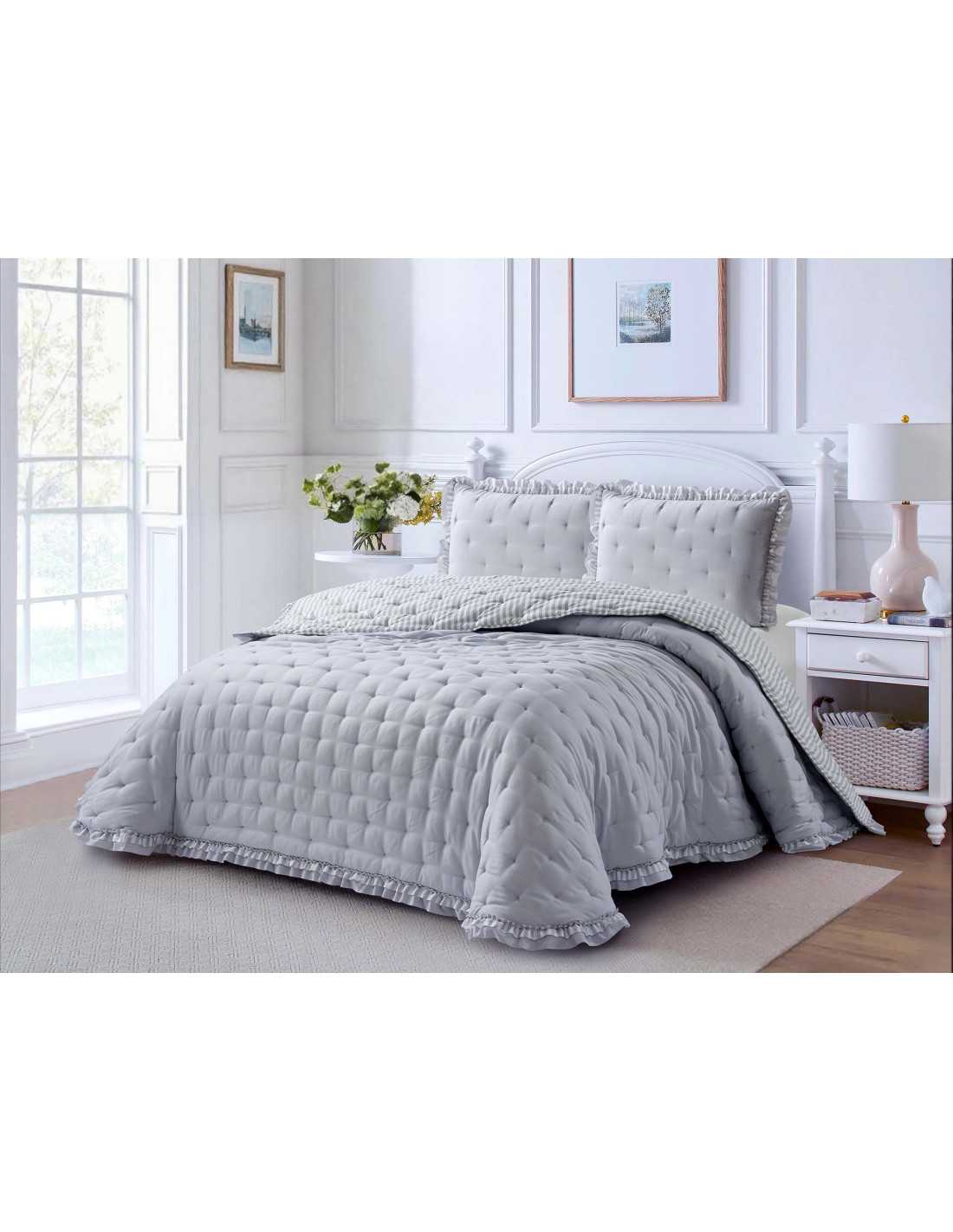 Edredão reversível e elegante em cinza Wendy, da Dolz, com folho duplo e enchimento de 300 gramas. Decore e aqueça o seu quarto nesta estação.
