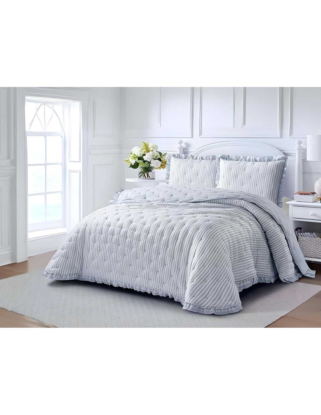 O edredão reversível Wendy apresenta um design clássico e elegante com folho duplo em cinza. Tem um enchimento de 300 gramas, perfeito para os meses mais frios.