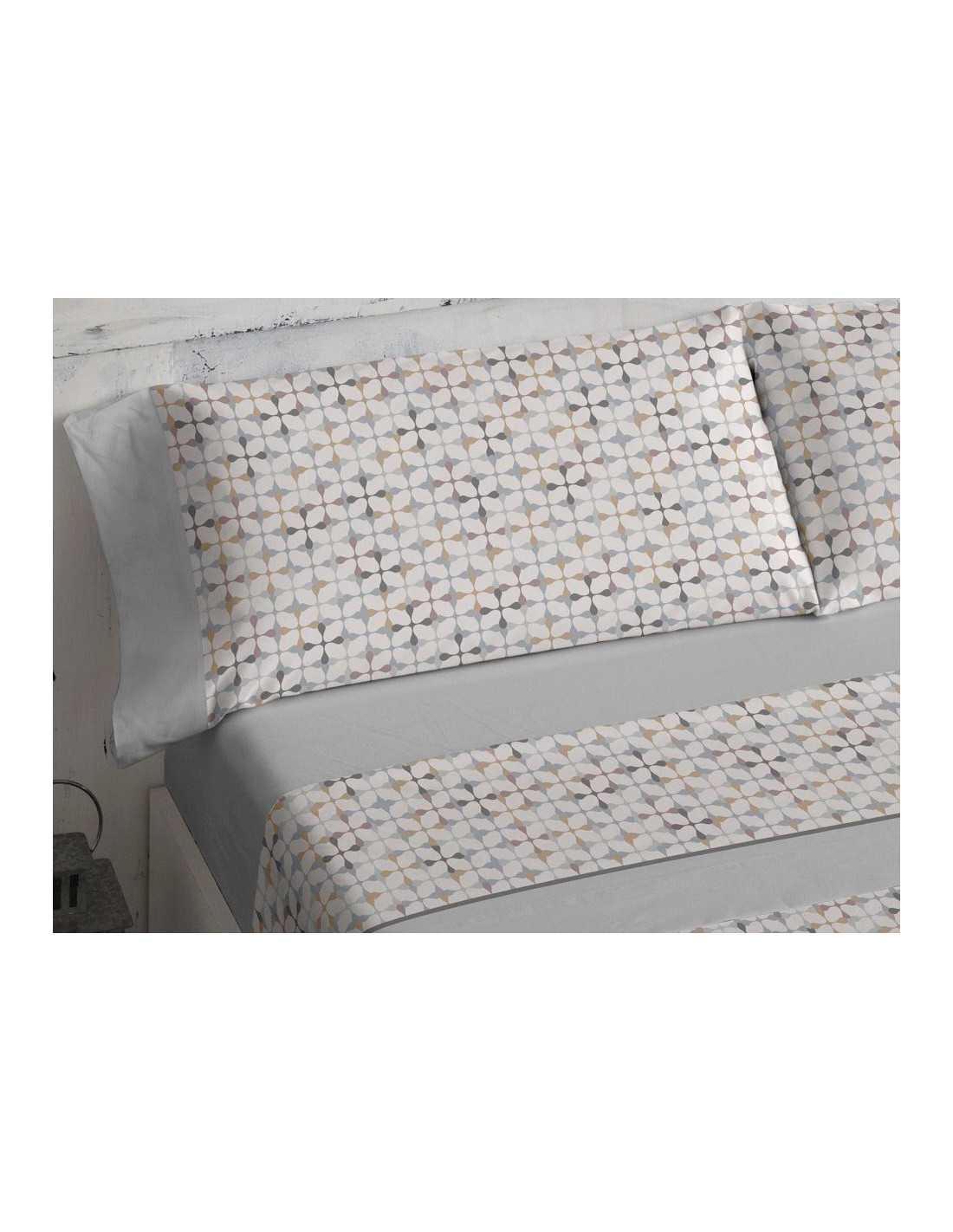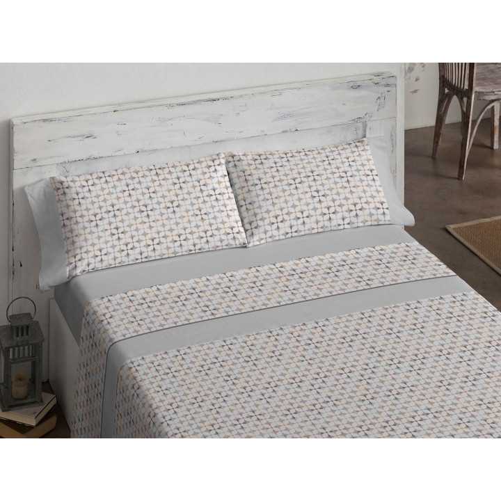 Mosaic é um conjunto de folhas impressas com um design moderno em dois tons diferentes. O fundo é liso. O lençol de cima e o travesseiro são feitos com um aplique do lençol de baixo mais o acabamento correspondente. Um design exclusivo Burrito Blanco.