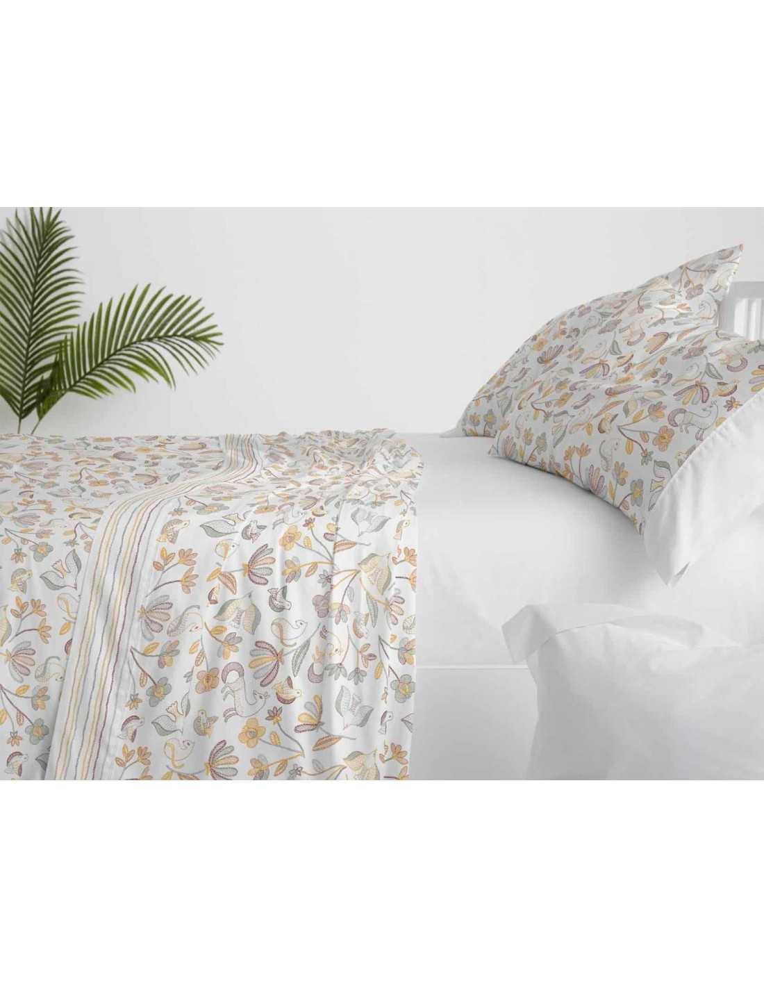 Conjunto de lençóis Burrito Branco com um desenho muito natural com flores e animais, em 50% algodão para um engomar fácil.
