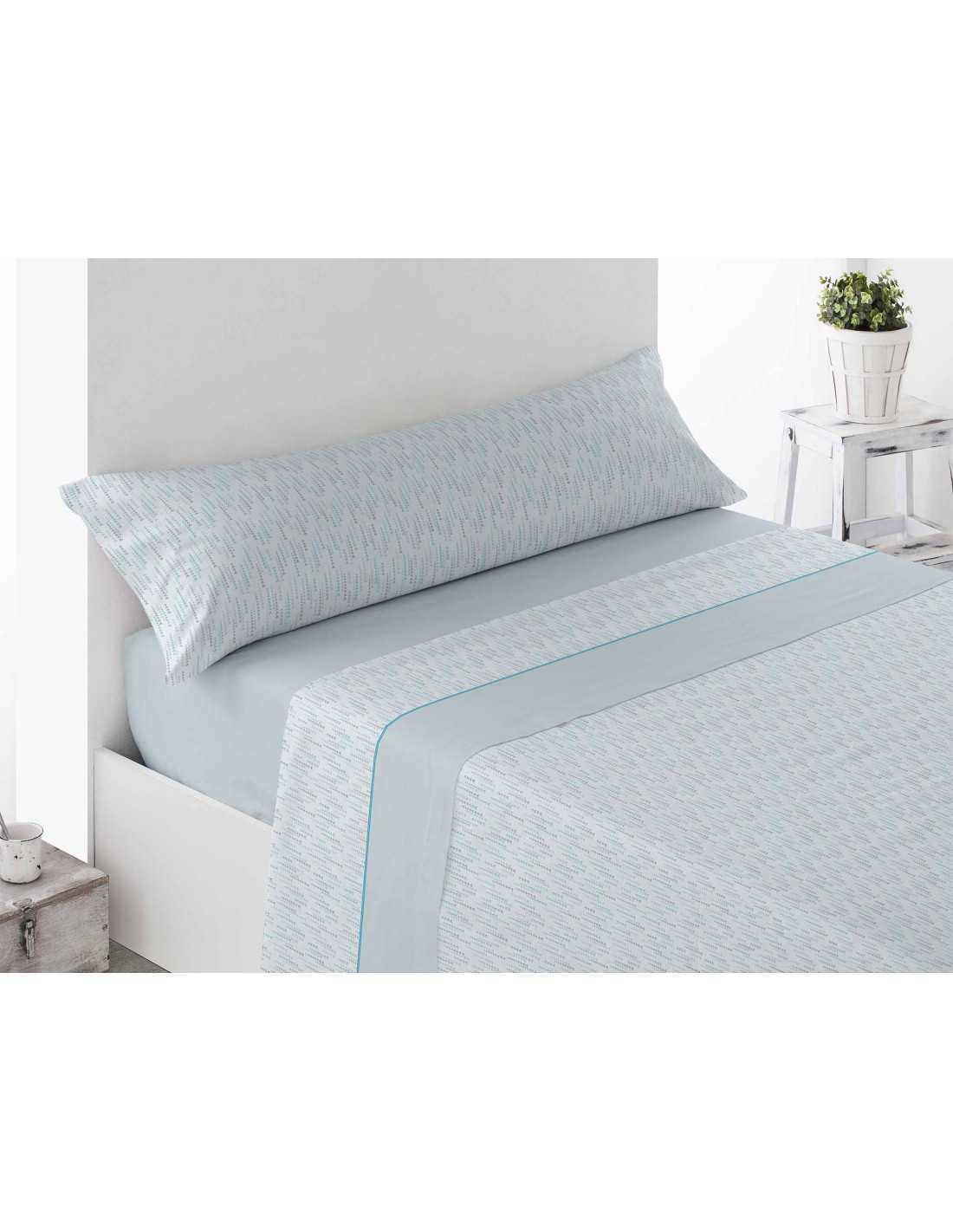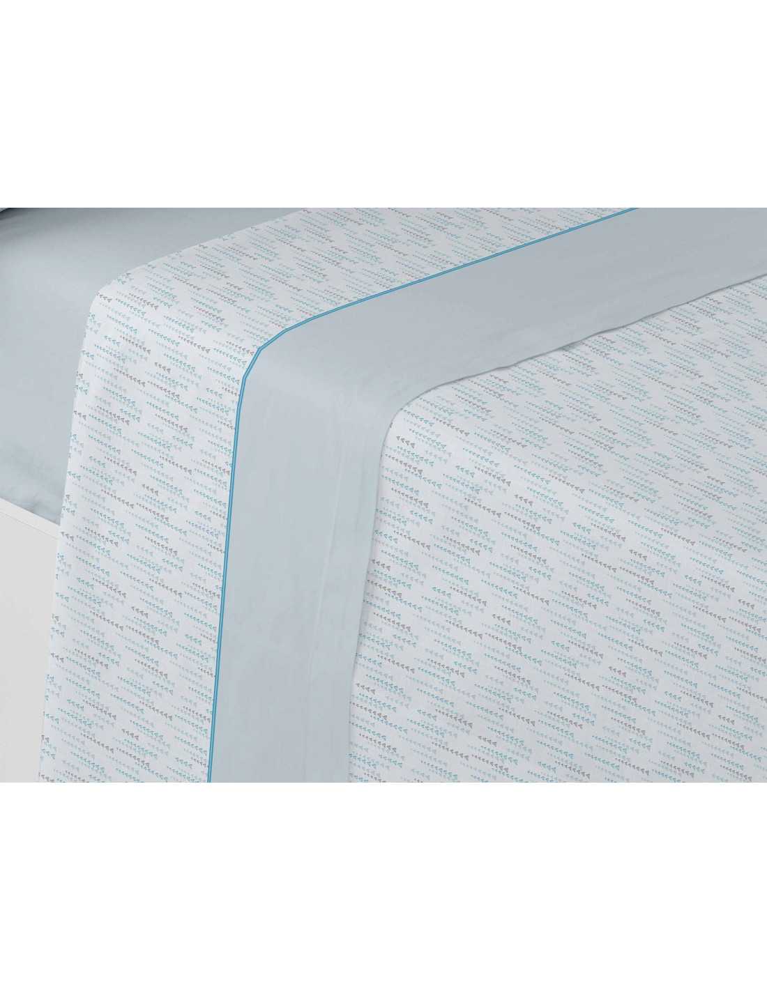 Jogo de lençóis térmicos com estampado às riscas de pequenos triângulos azuis, muito macios e leves. Os lençóis polares perfeitos para o inverno.