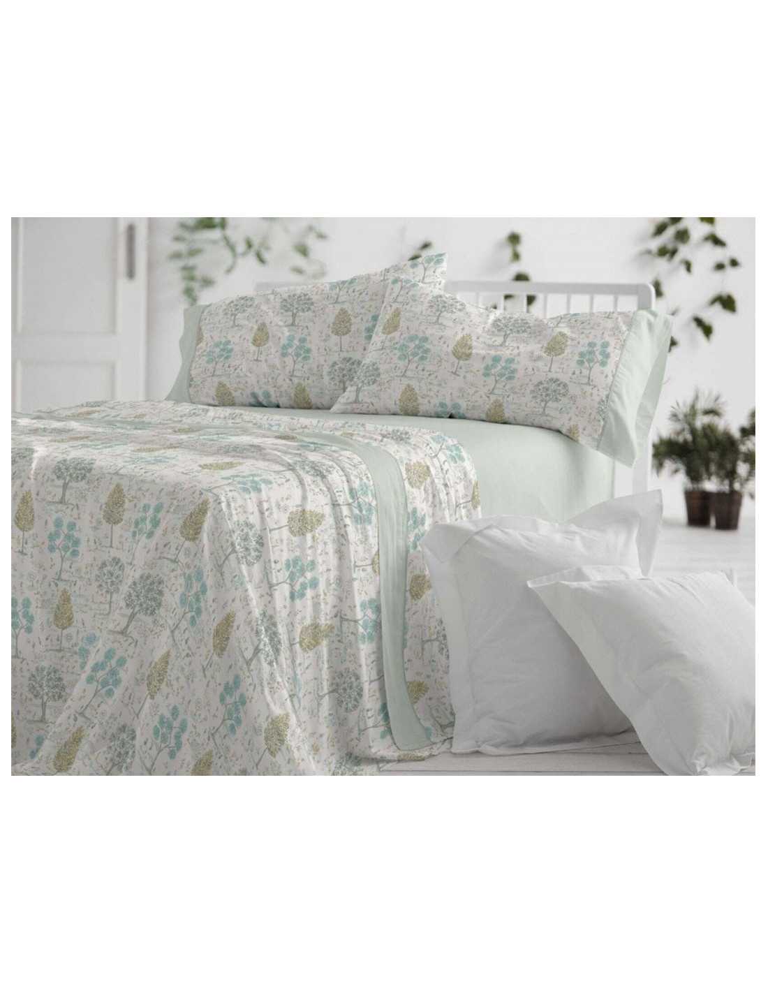O jogo de lençóis Eugenia da Burrito Blanco tem um design moderno e altamente decorativo com motivos botânicos de árvores em tons de verde, menta e turquesa sobre um fundo creme. O lençol com elástico é liso, e o lençol de cima e a almofada apresentam um acabamento liso. É fabricado em 50% algodão e 50% poliéster.