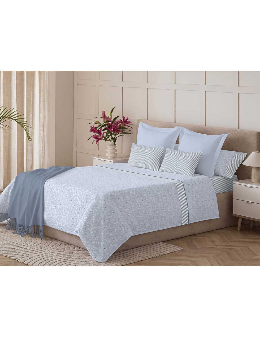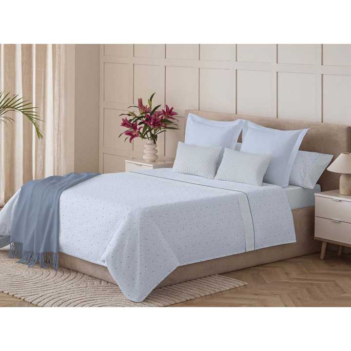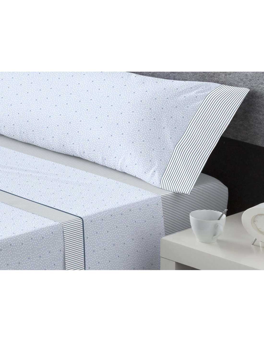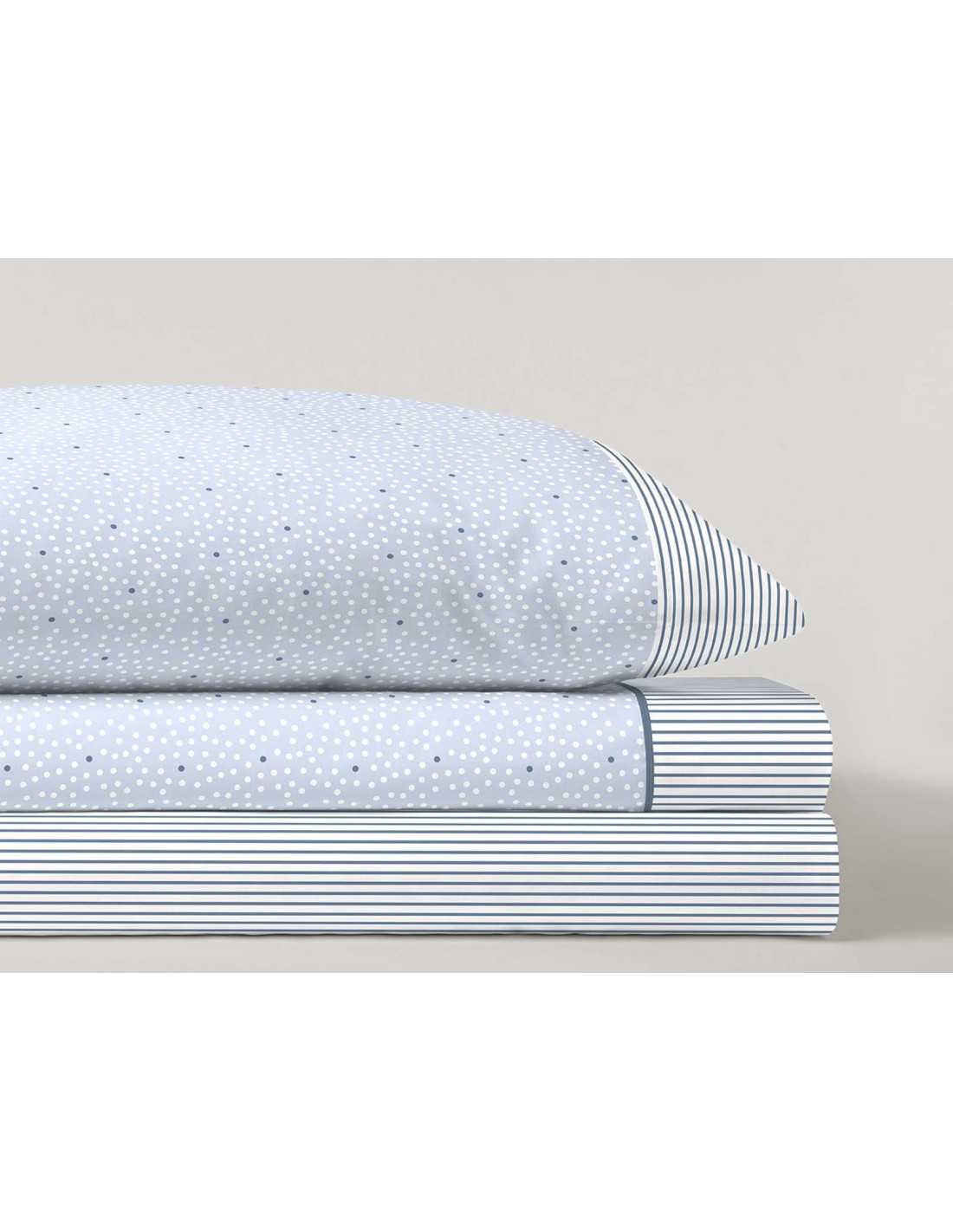 Jogo de lençóis 50% algodão/50% poliéster com um bonito desenho de bolinhas e riscas em tons de azul e branco. Conjunto de três peças. Ideal para meia-estação e verão.