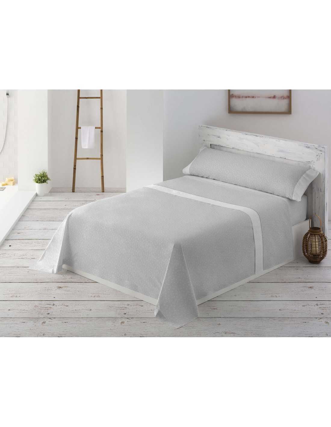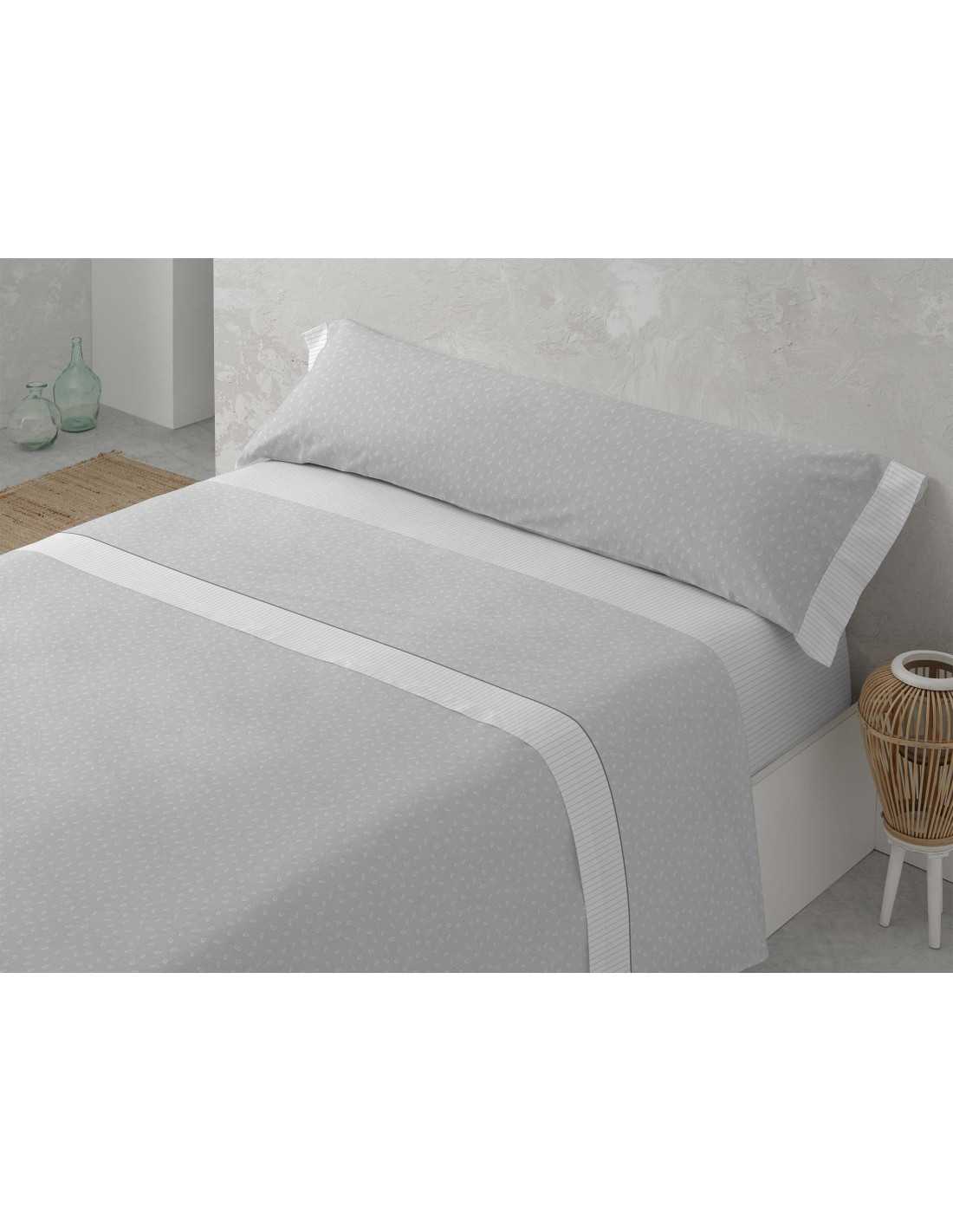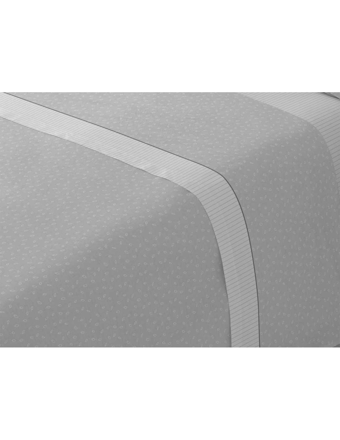 Jogo de lençóis em algodão e poliéster na cor cinzenta com um bonito design de pequenas folhas, com lençol de baixo e detalhes no lençol de cima e fronha em tecido às riscas.