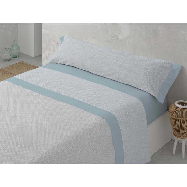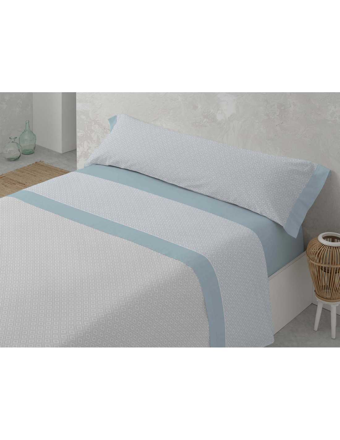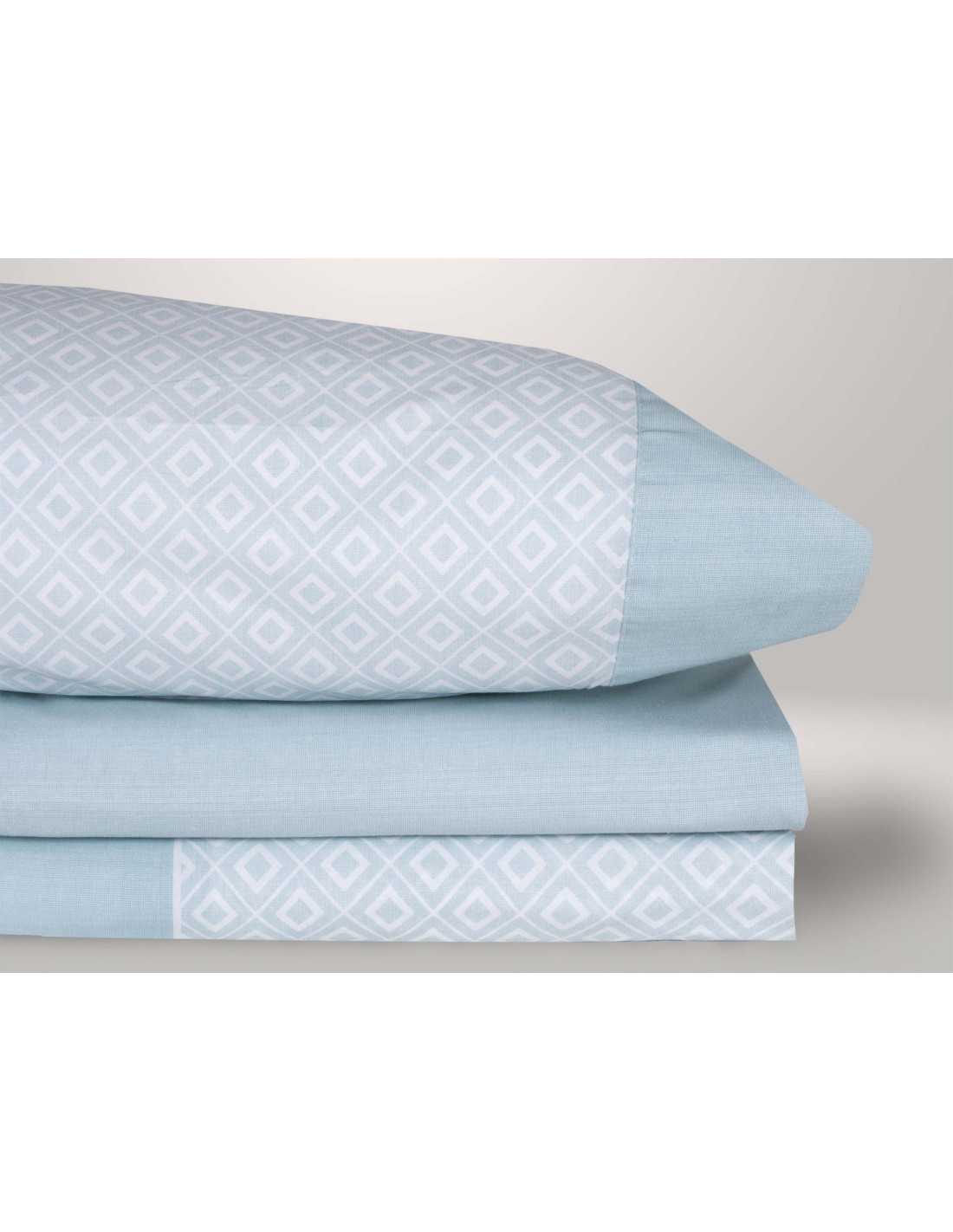 Isis é um conjunto de lençóis com um elegante design de diamantes em verde-água, composto por um lençol de baixo liso e um lençol de cima a condizer. Um conjunto de lençóis cheio de estilo para decorar a sua cama a um preço fantástico.