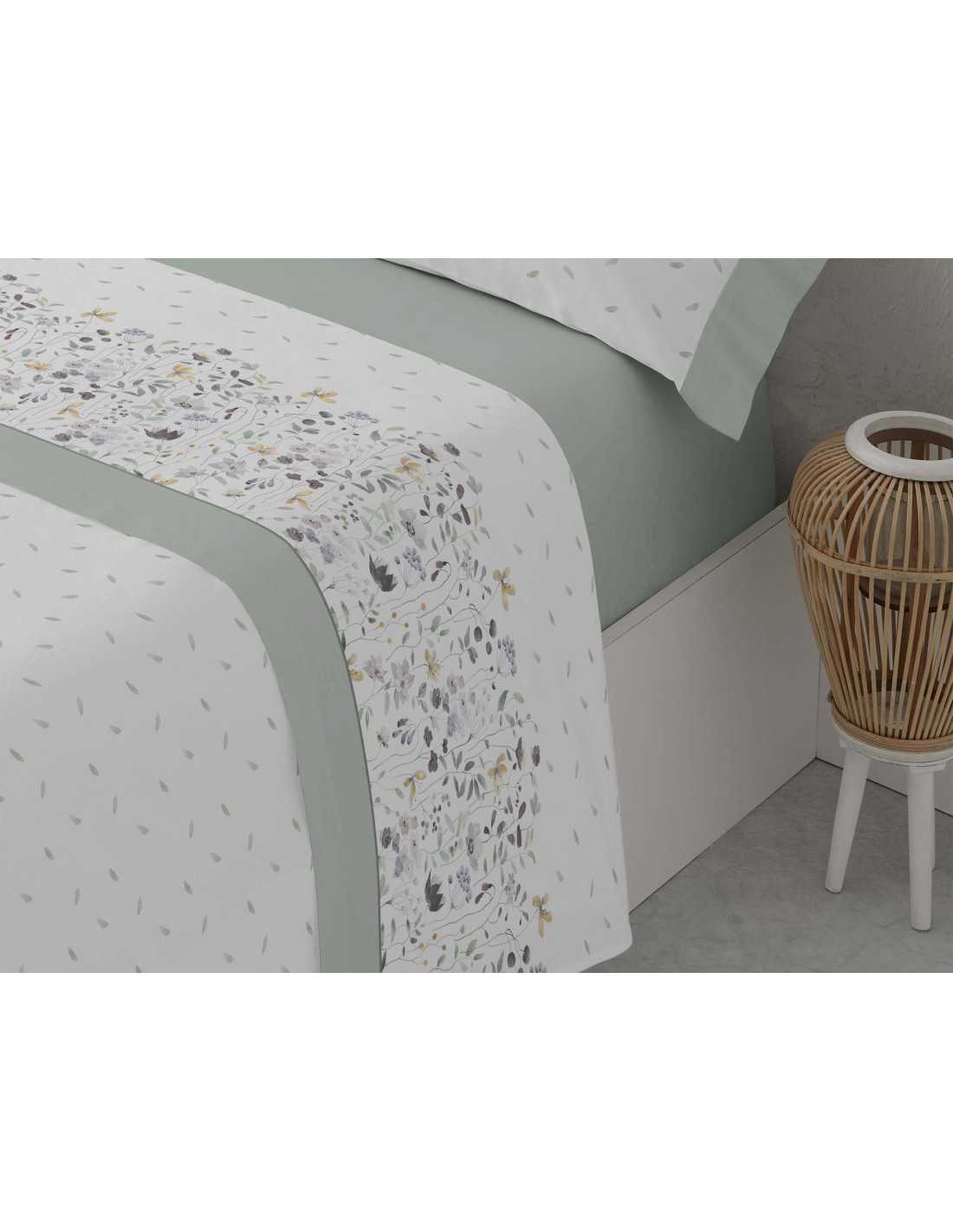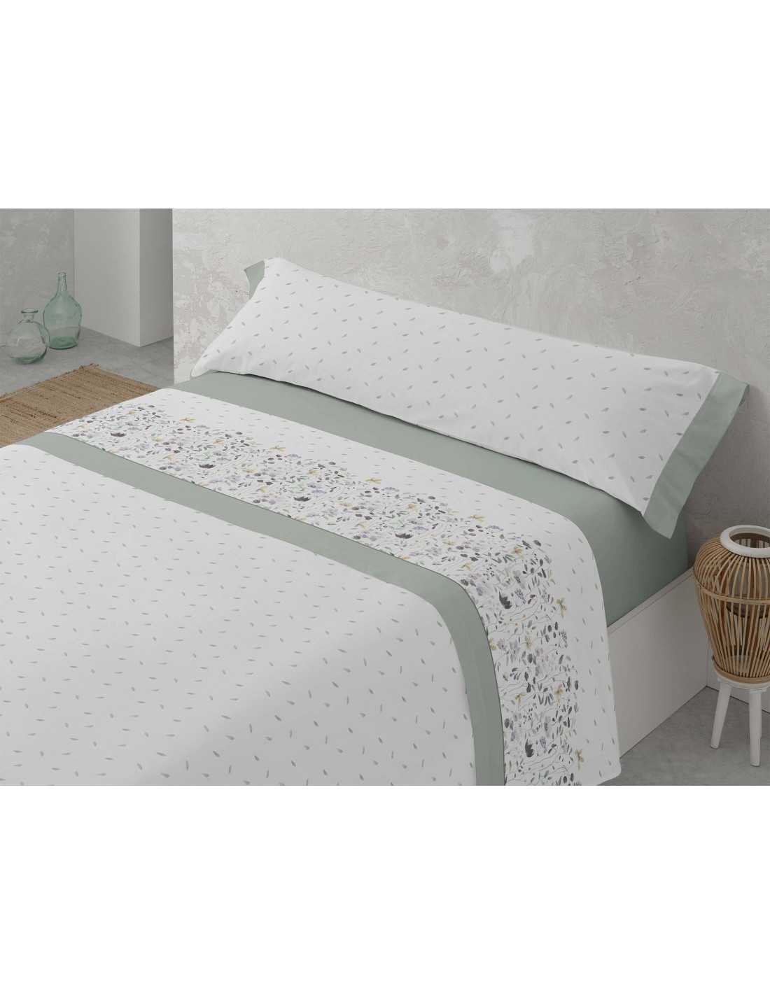 Conjunto de lençóis em algodão e poliéster em tons de verde com detalhes em amarelo e malva, com um bonito desenho de pétalas e estampado floral na bainha, combinado com um lençol com elástico de cor lisa e detalhes de fronha de cor lisa.
