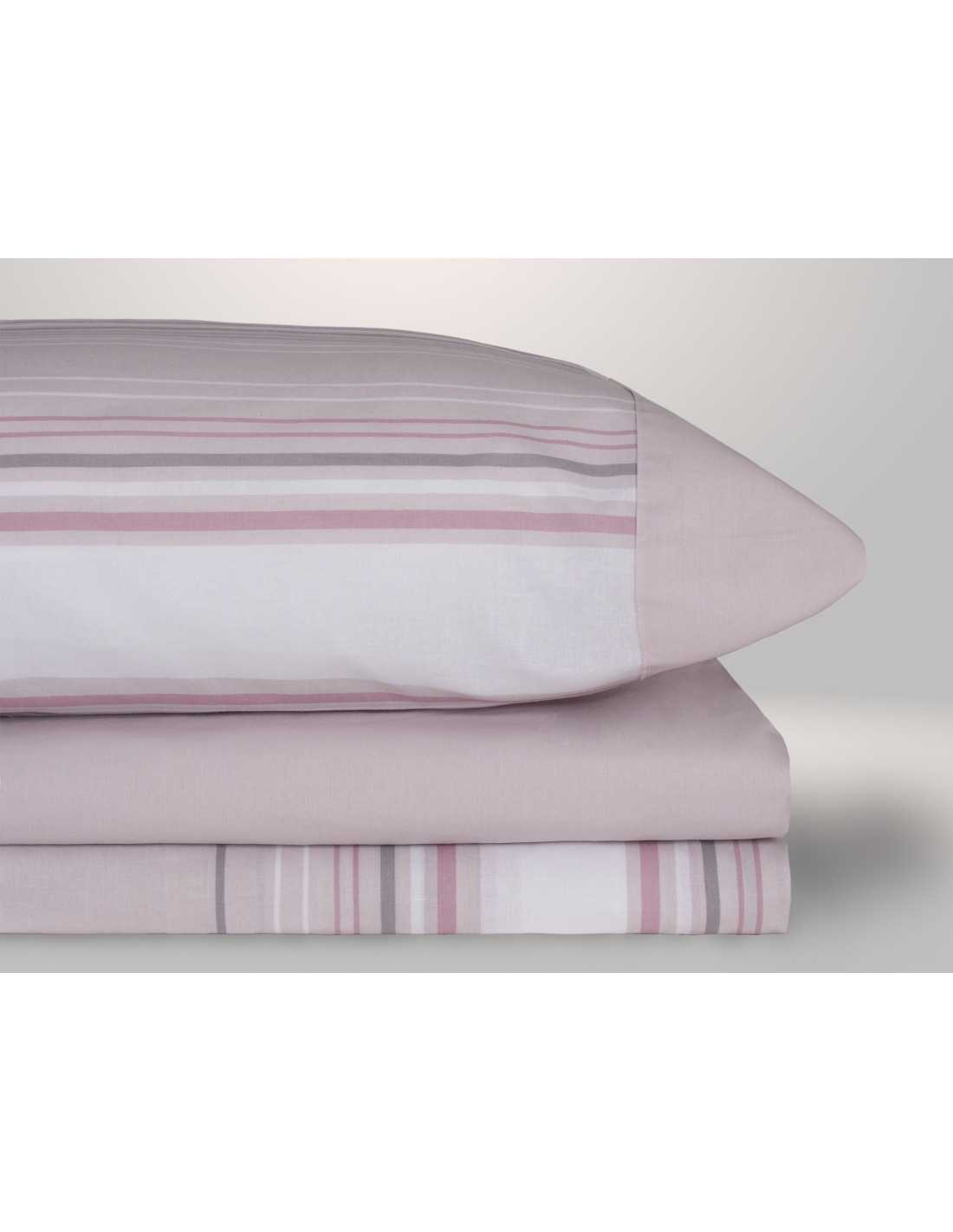 Conjunto de lençóis de algodão e poliéster em tons de bege com detalhes coloridos, com um design listrado simples combinado com um lençol com elástico de cor sólida e fronhas de cor sólida a condizer.