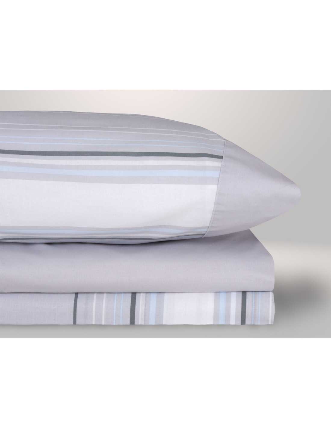 Conjunto de lençóis de algodão e poliéster em tons de cinza com detalhes coloridos, com um design listrado simples combinado com um lençol com elástico de cor sólida e fronhas de cor sólida a condizer.