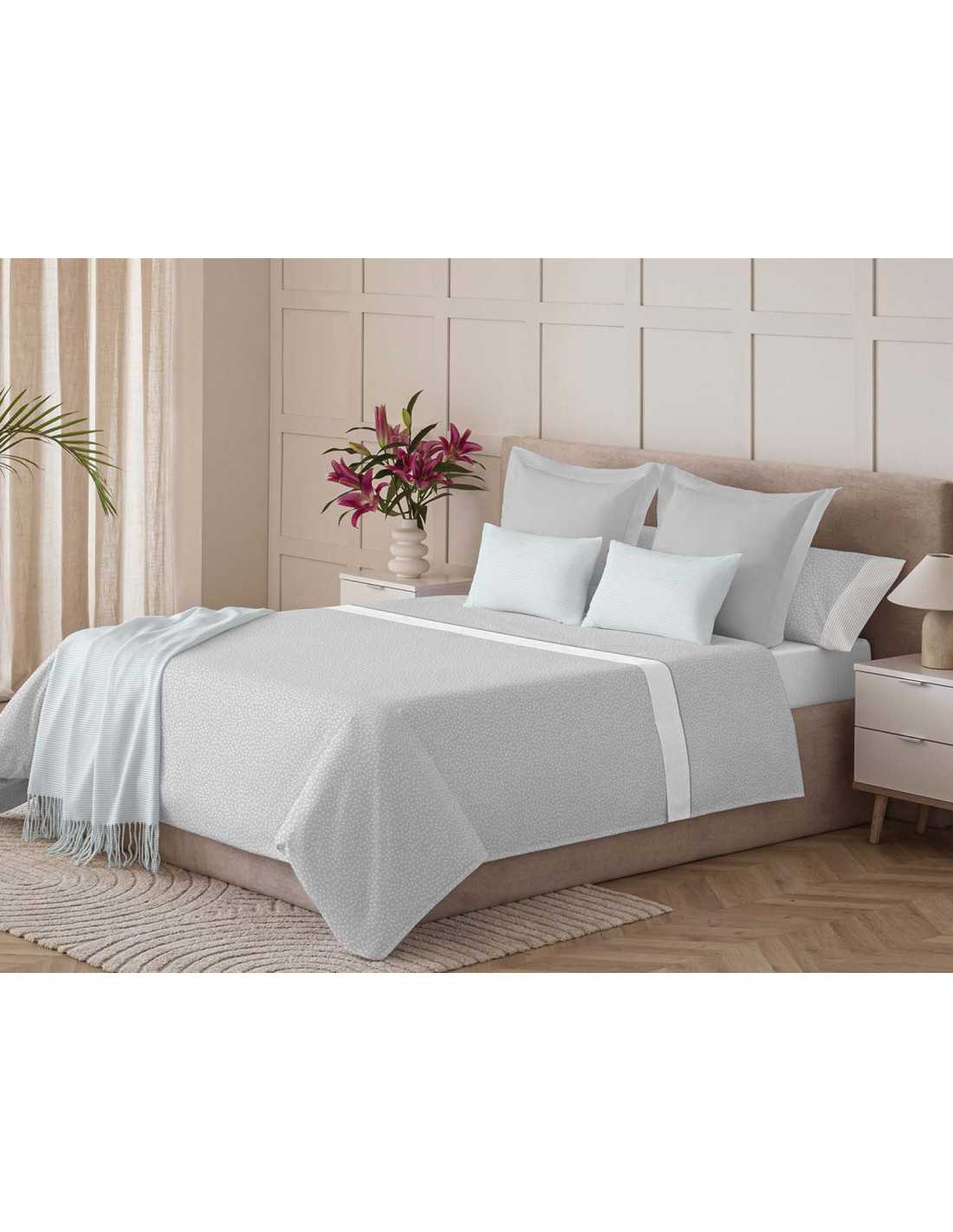 Jogo de lençóis 50% algodão/50% poliéster com design simples e elegante, com pequenos círculos irregulares em cinzento. Conjunto de três peças. Ideal para meia-estação e verão.