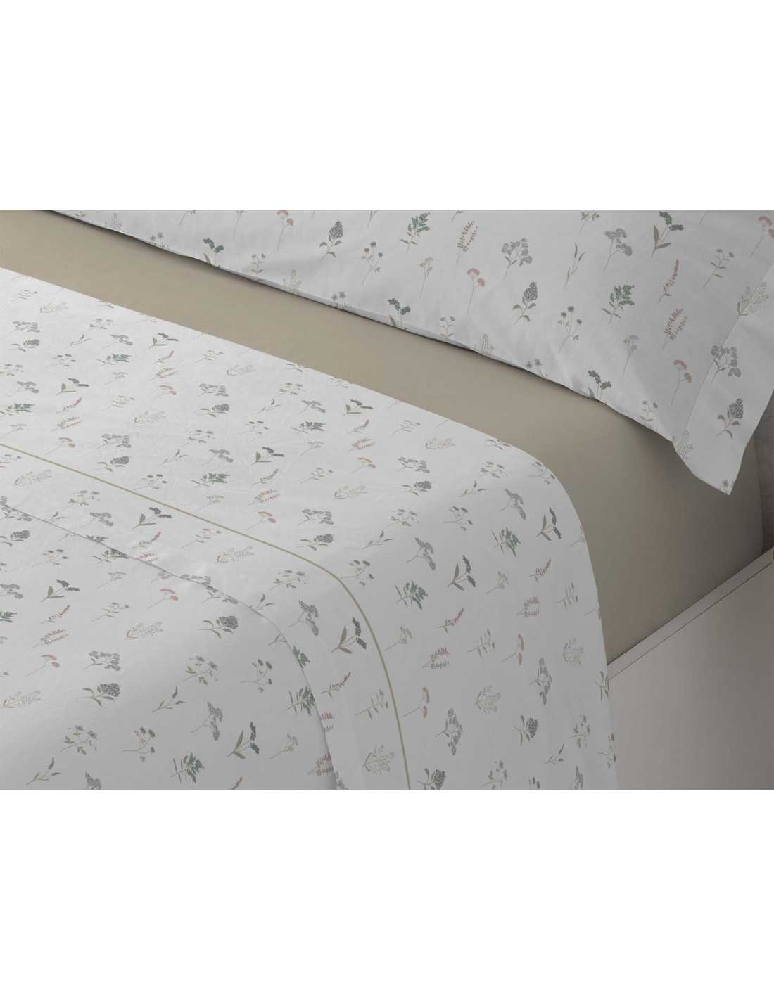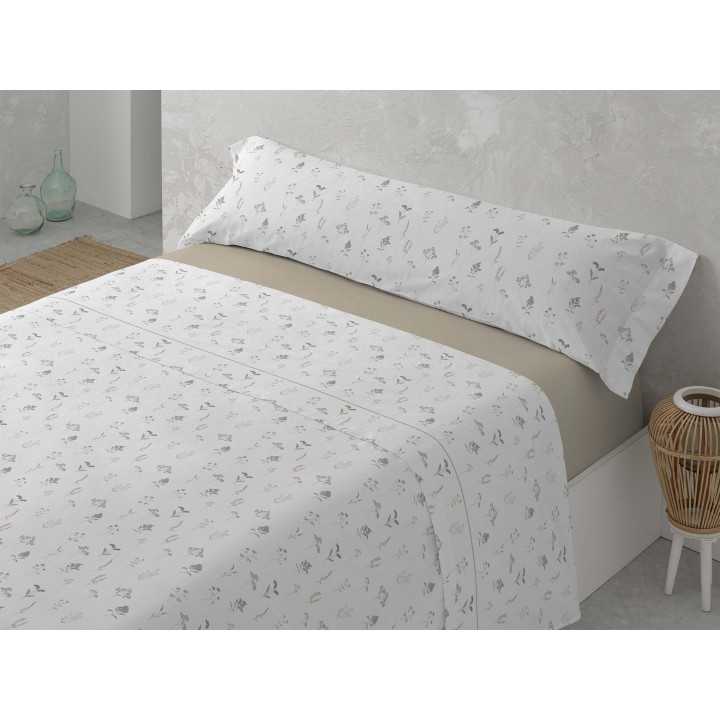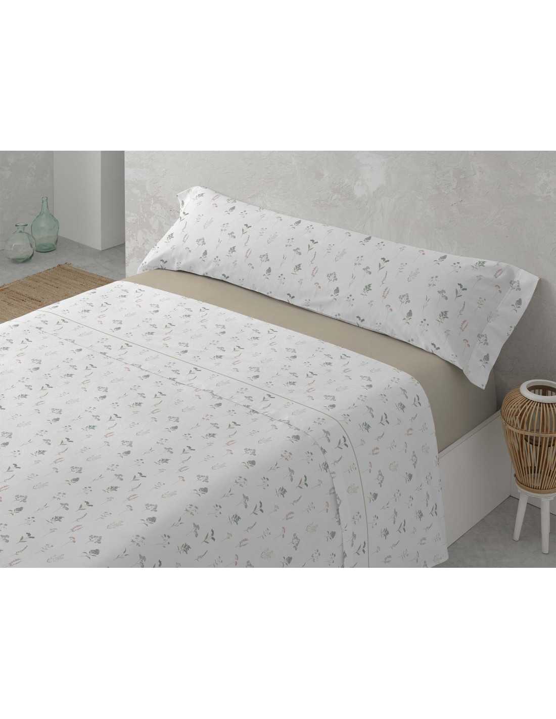 Jogo de lençóis em algodão e poliéster em tons de bege com um bonito e marcante desenho floral combinado com um lençol com elástico de cor lisa a condizer.
