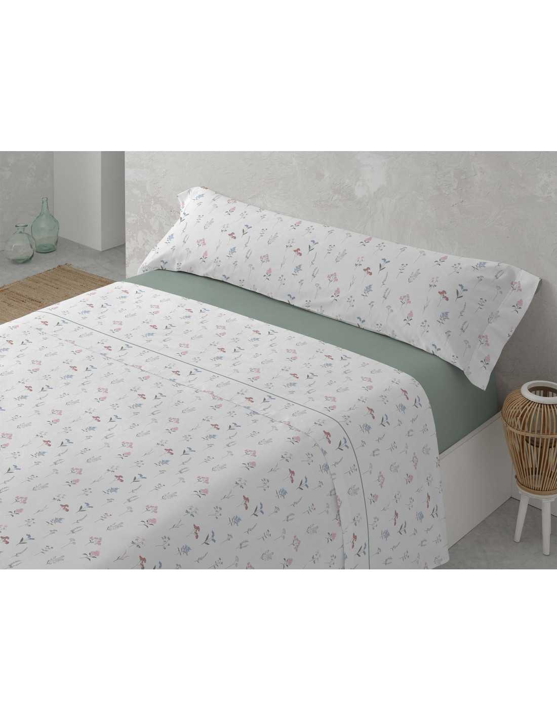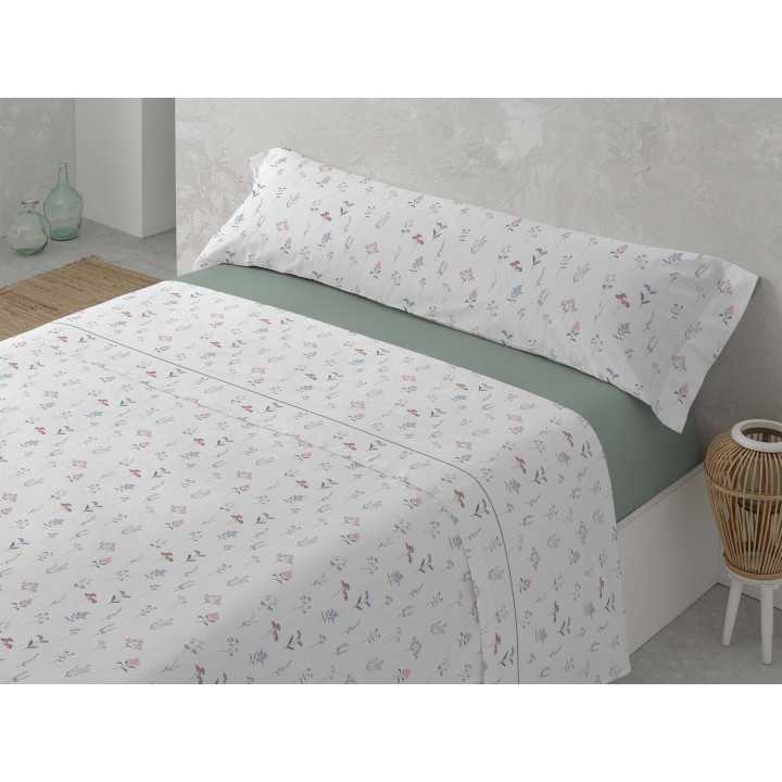 Jogo de lençóis em algodão e poliéster em tons de verde com um bonito e marcante desenho floral combinado com um lençol com elástico de cor lisa a condizer.