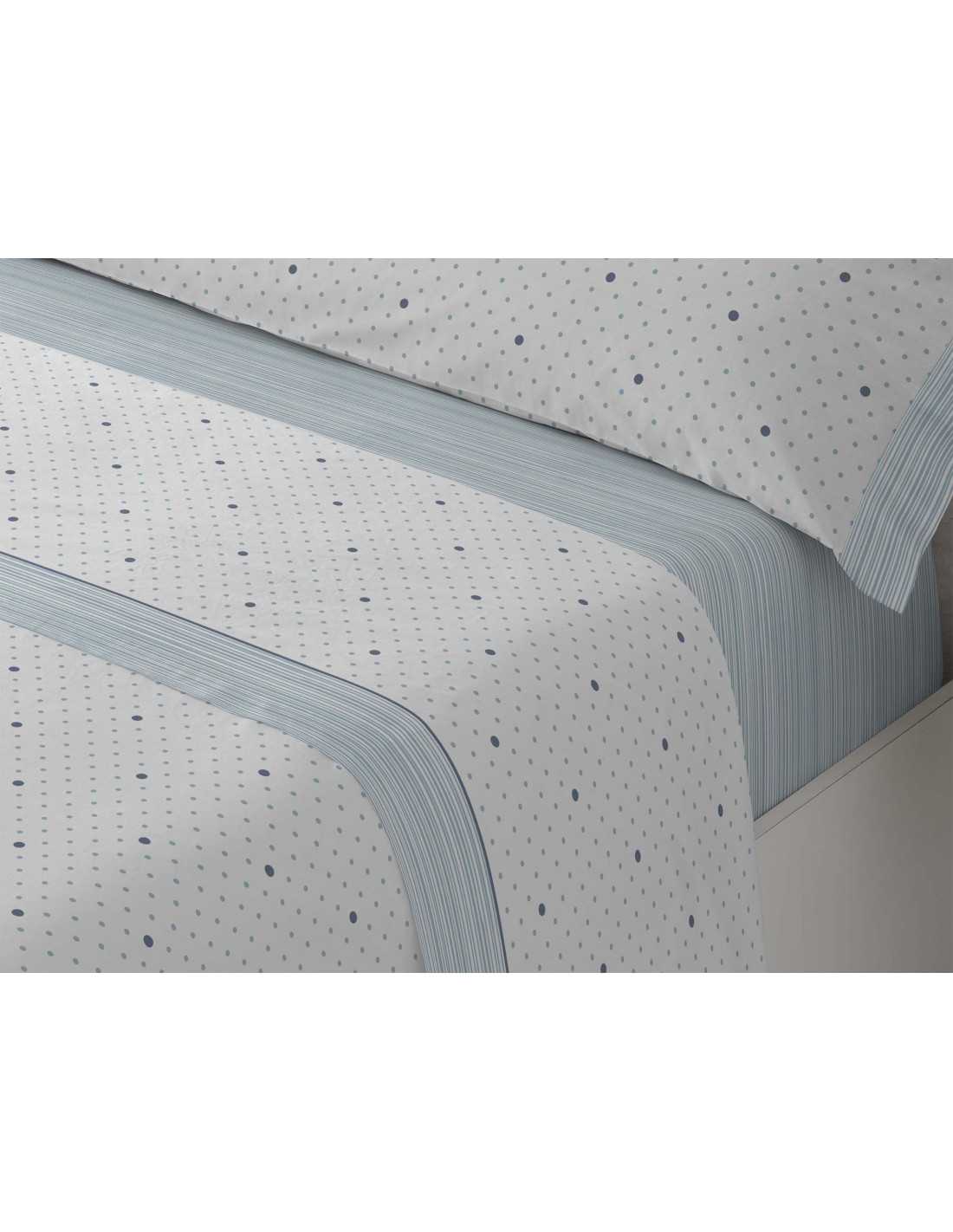 Conjunto de lençóis de algodão e poliéster azul com um design decorativo às bolinhas combinado com um lençol com elástico finamente listrado.