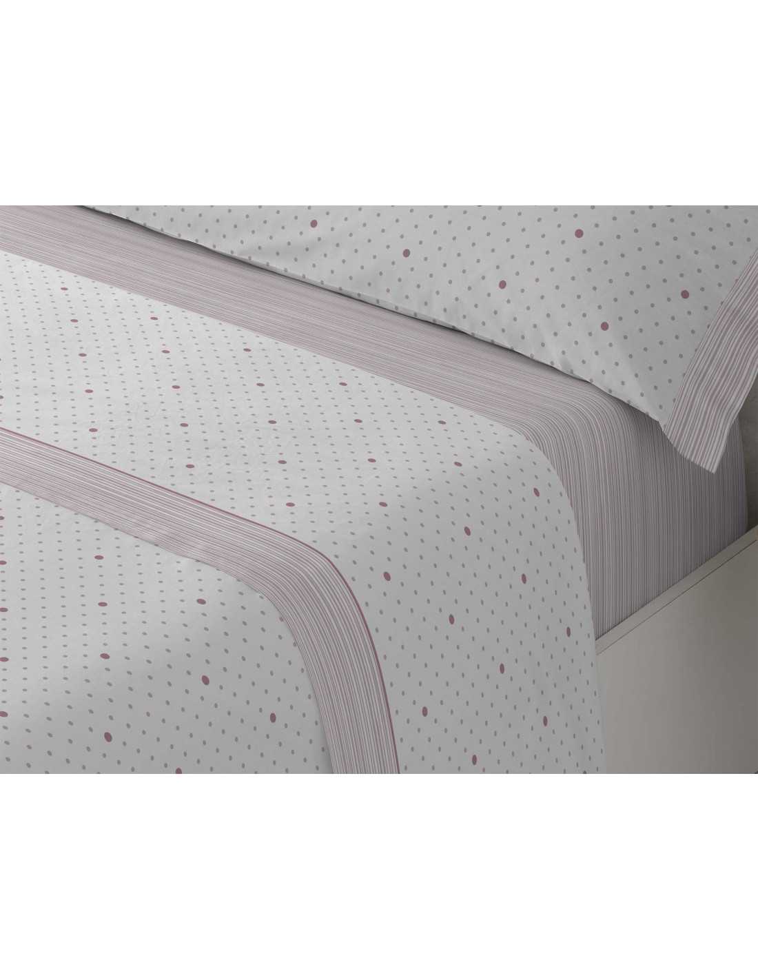 Conjunto de lençóis de algodão e poliéster rosa com um design decorativo às bolinhas combinado com um lençol com elástico finamente listrado.