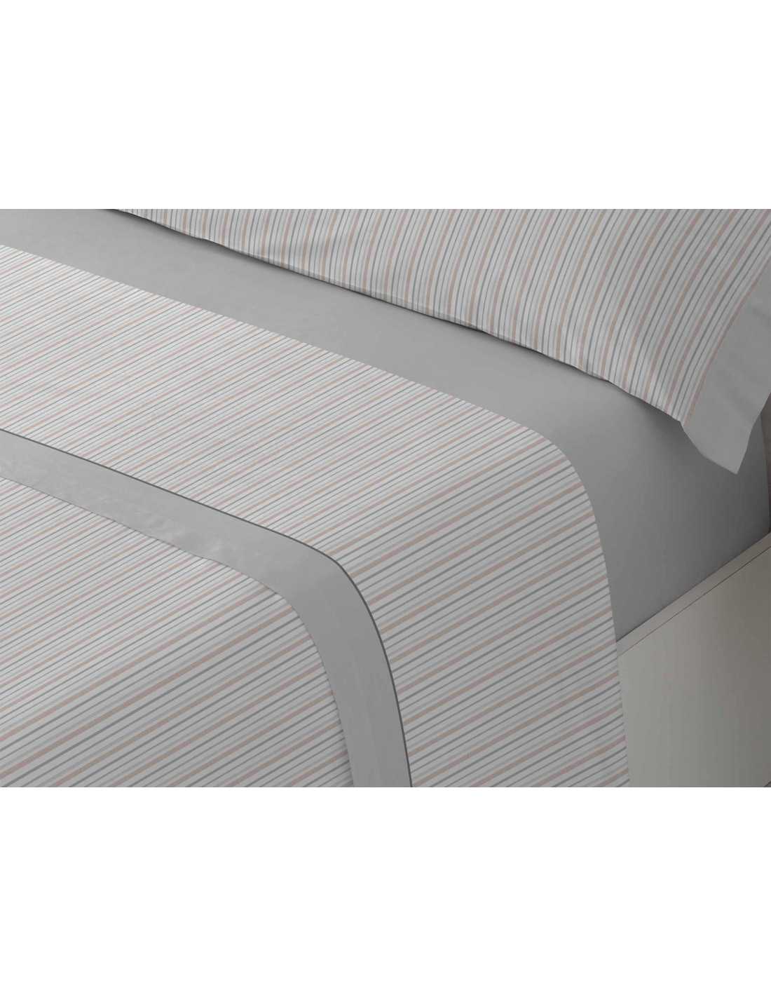Jogo de lençóis em algodão e poliéster na cor cinza com um design simples às riscas combinado com o lençol com elástico liso a condizer.