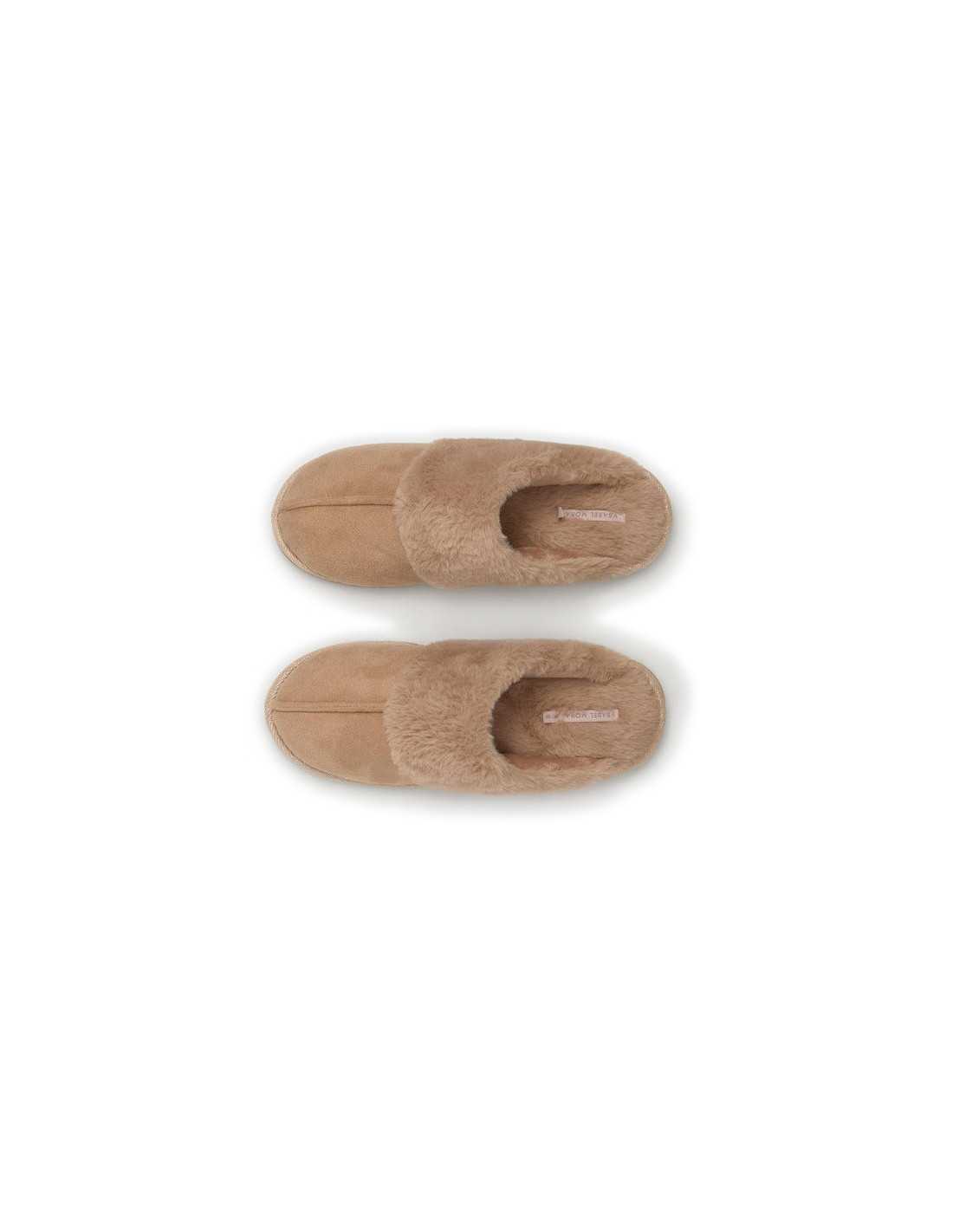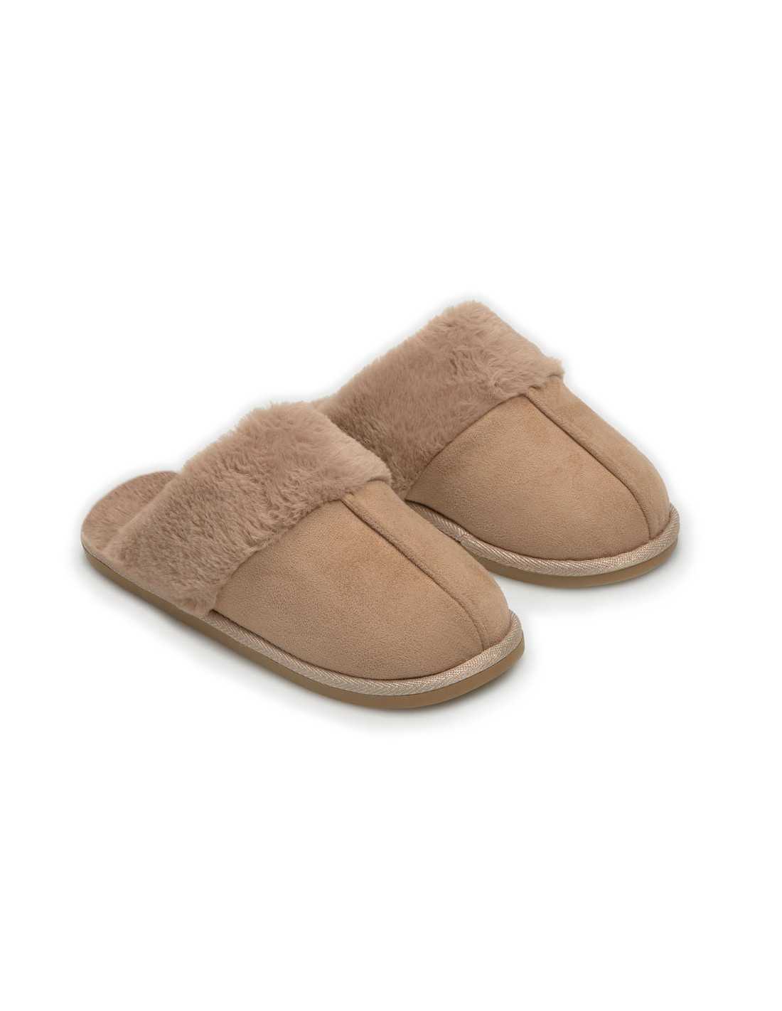 Chinelos de casa de mulher feitos em tecido de pele falsa com pele com interior macio e sola rígida.