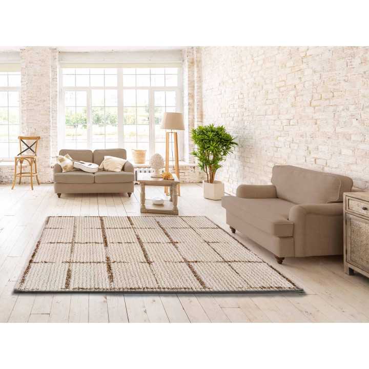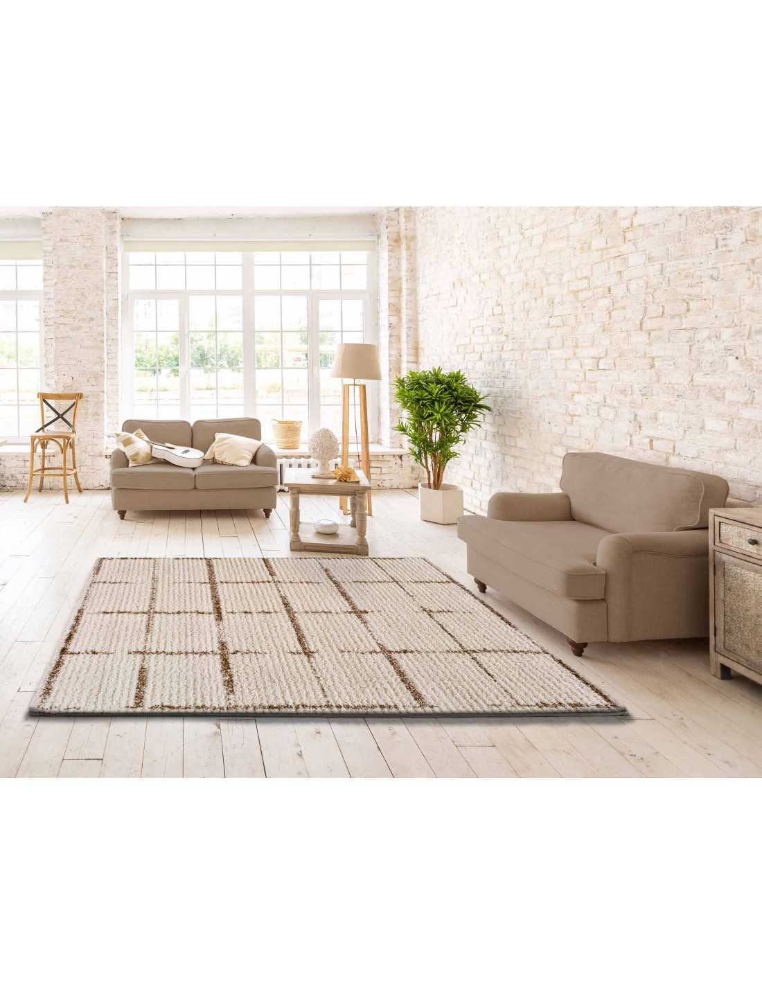 Roy é um tapete com desenho xadrez marrom sobre fundo branco, que vai decorar qualquer ambiente da sua casa. É confeccionado em PP HEAT-SET + Poliéster e juta no verso e comprimento de pelo de 35 mm. e uma densidade de 72.000 pontos por metro quadrado.