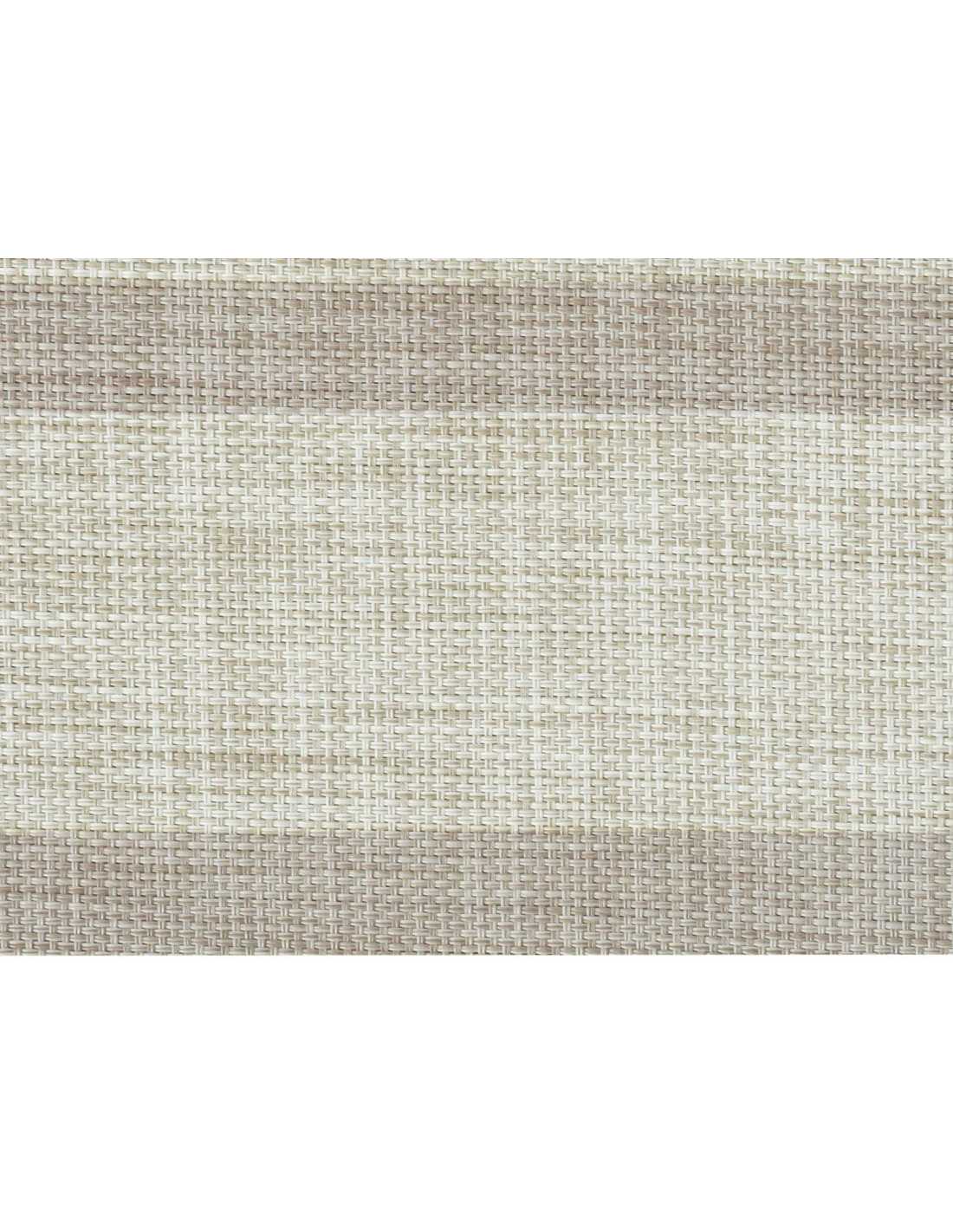 Tapete de vinil na cor bege adequado para interiores ou exteriores, com verso antiderrapante. Composição: 95% PVC e 5% PES. Tem uma espessura de 2 mm.