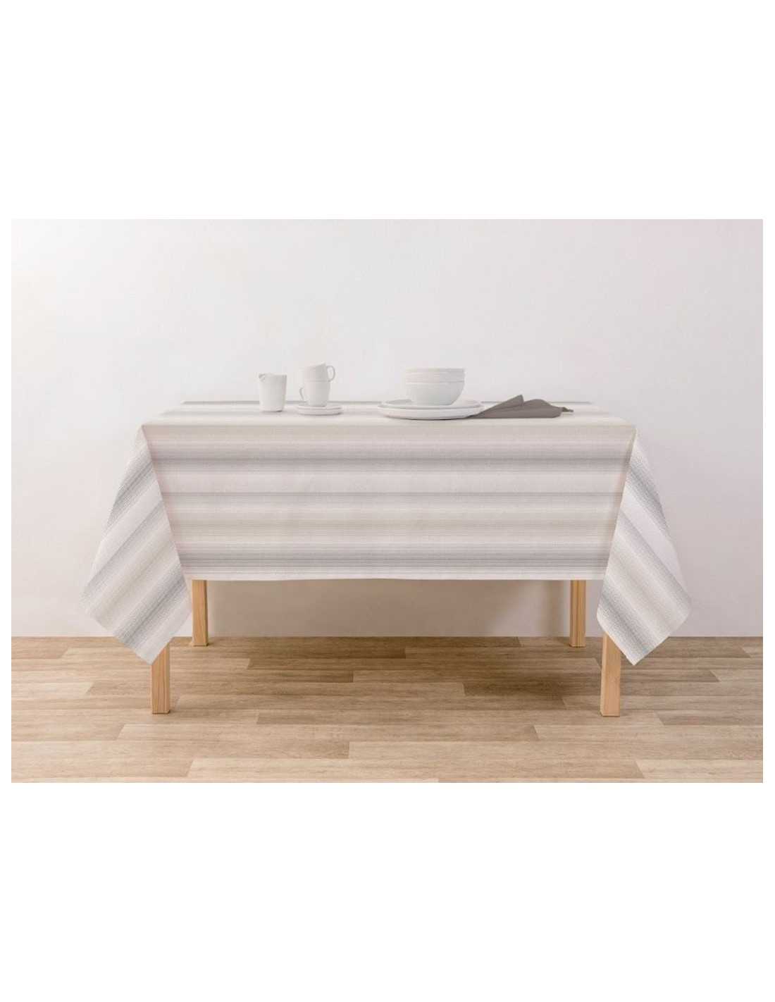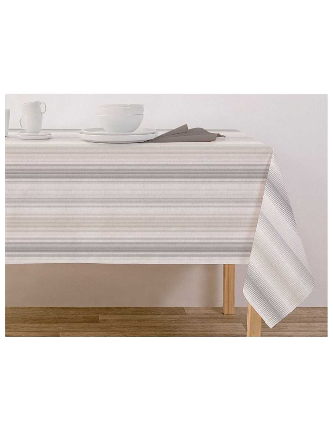 Mestizo é uma toalha de mesa antimanchas com estampado de riscas em tons bege e cinzento que vai vestir a sua mesa com simplicidade e elegância.
